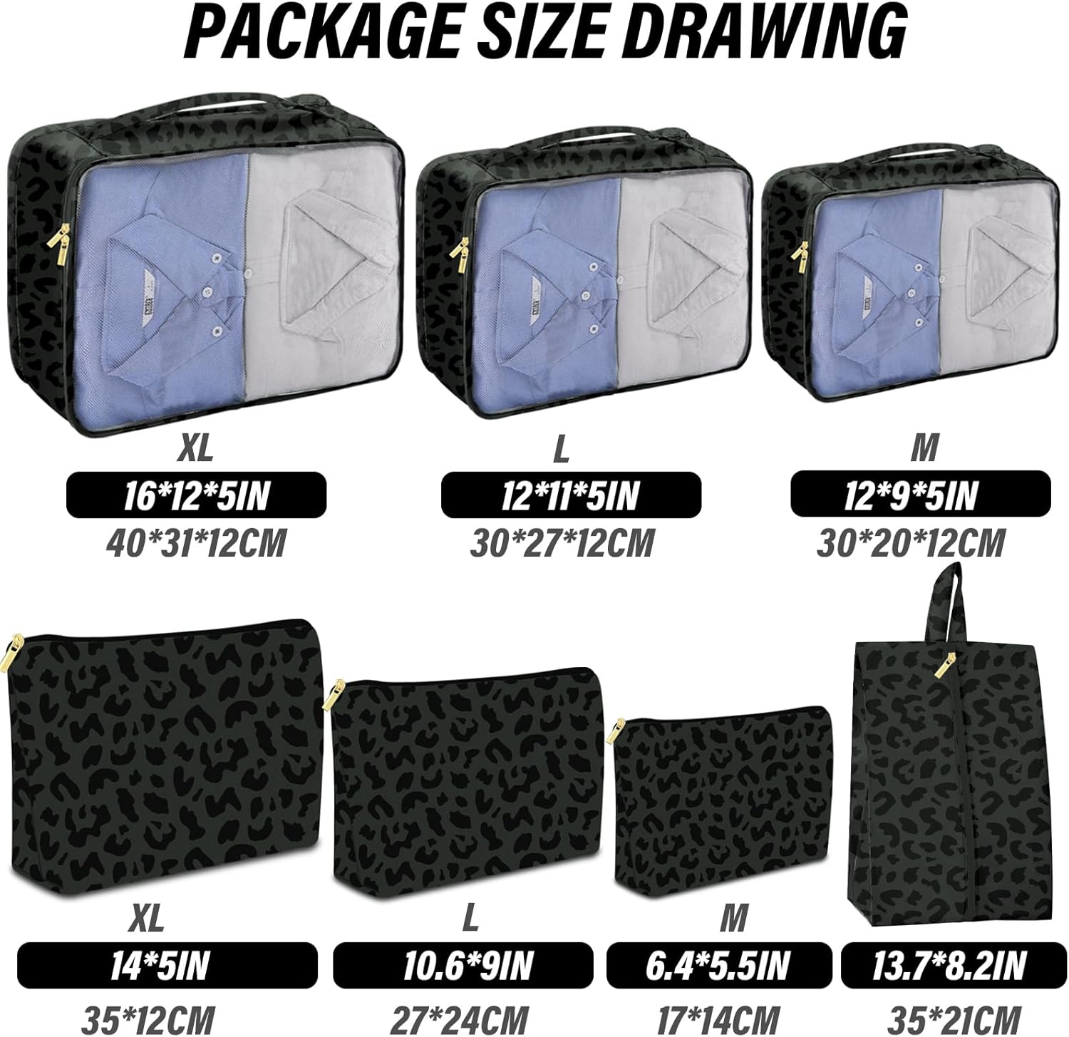 This 7-piece packing cube set offers a stylish and practical solution for organizing travel essentials. Designed with women and girls in mind, the set combines functionality with a bold black leopard cheetah print that adds personality to your luggage. Made from smooth, lightweight nylon oxford fabric, each piece is built to protect your clothes from wrinkles, spills, and everyday wear. Whether you’re heading out for a weekend getaway, a business trip, or a family vacation, this set helps you pack smarter, stay organized, and arrive looking put-together.