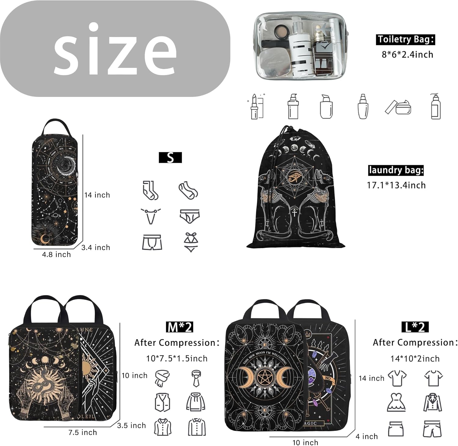 8-Piece Compression Bags for Travel Set: Includes 2 different sizes of travel compression bags for packing(4 pieces), 1 toiletry bag, 1 travel shoe bag, 1 tube cube, 1 drawstring laundry bag. Every experienced traveler understands the importance of organization, and with these compression travel cubes, packing becomes effortless, and also makes airport security checks quick and convenient