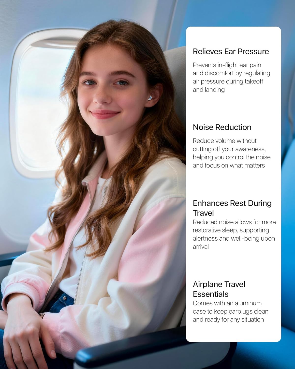 [Always with You]: Included a waterproof aluminum case with carabiner, making it easy to attach to your bag or carry on your keychain, always be within reach when you need them. Get these airplane ear plugs, insert them properly, enjoy pain-free flying.