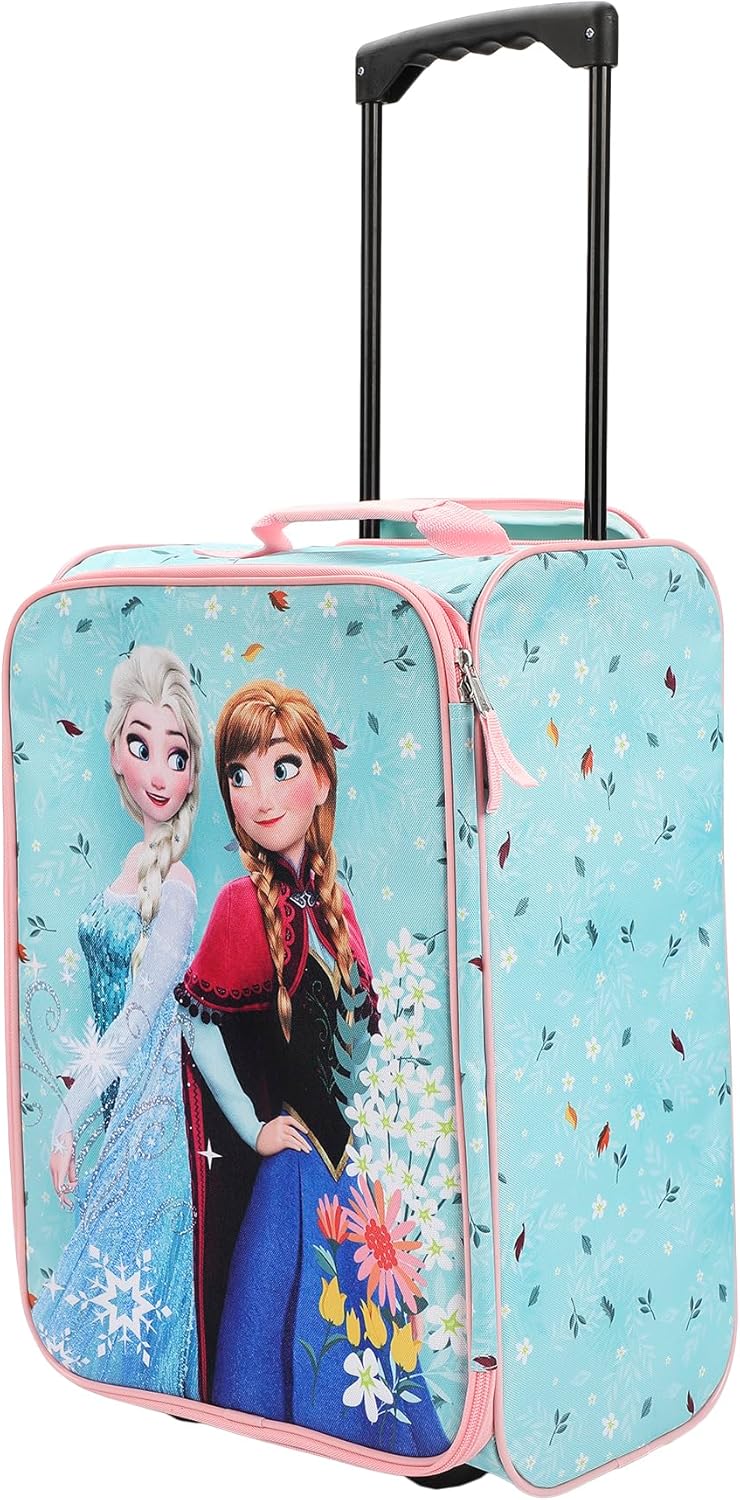 Please note that this product is intended for ages 3 and up, with adult supervision recommended during initial setup and use to ensure proper handling of the telescopic handle and wheel mechanism. Always store the suitcase in a dry environment to maintain fabric quality and prevent damage from moisture. Do not machine wash; instead, clean the exterior gently with a damp cloth as needed. Accessories depicted in product images are for illustrative purposes only and are not included. This is an officially licensed Bioworld product, guaranteeing authentic character representation, accurate sizing, and adherence to safety standards. Package includes one Frozen Anna & Elsa pilot case only—no additional items come with purchase.