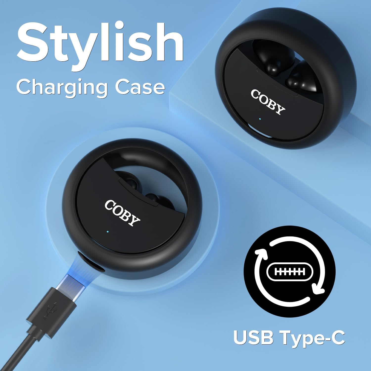 LONG-LASTING BATTERY: Enjoy up to 8 hours of total listening time with these Coby wireless earbuds. The efficient battery lets you power through calls and on-the-go use without constantly recharging. Use a USB-C cord to charge the rotating case, and your Bluetooth headphones will stay ready to keep you connected throughout your day.