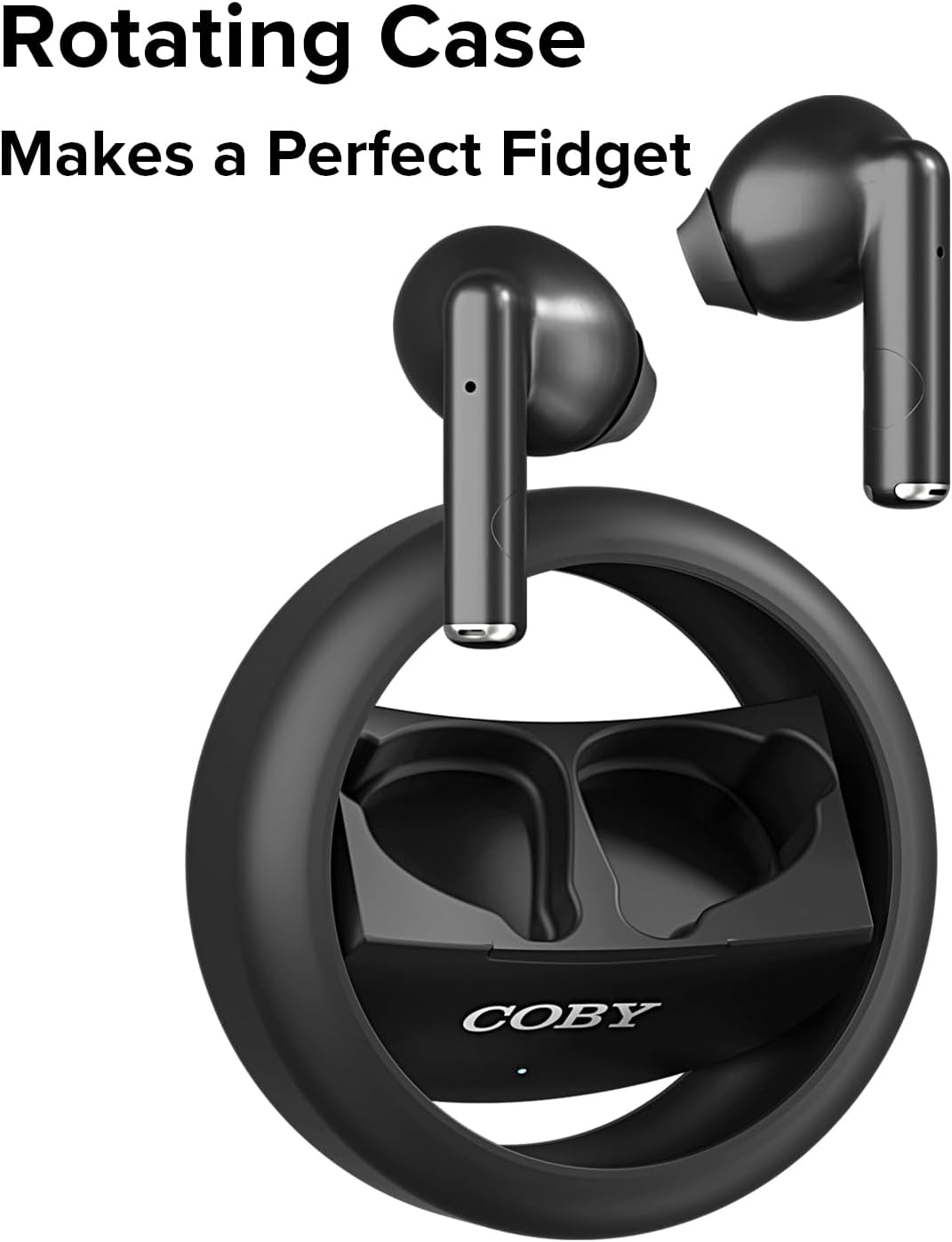 Coby Spinning True Wireless Earbuds, Noise-Isolating Bluetooth in-Ear Headphones with Spinner Case, Sweat-Resistant Design, One-Step Pairing, and Touch Controls, 8-Hour Playtime, Black