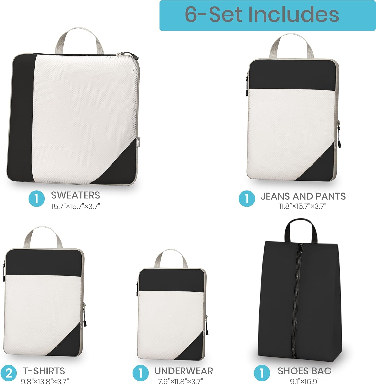 These Compression Packing Cubes offer a smart solution for travelers seeking maximum space efficiency and better organization. Designed by Sonnetto, this set of six expandable luggage organizers helps reduce packed clothing volume by up to 50%, making it easier to fit more into both carry-on and checked suitcases. The cubes combine durable construction with practical features like mesh visibility and airtight compression, ideal for frequent flyers or anyone who values neat packing.