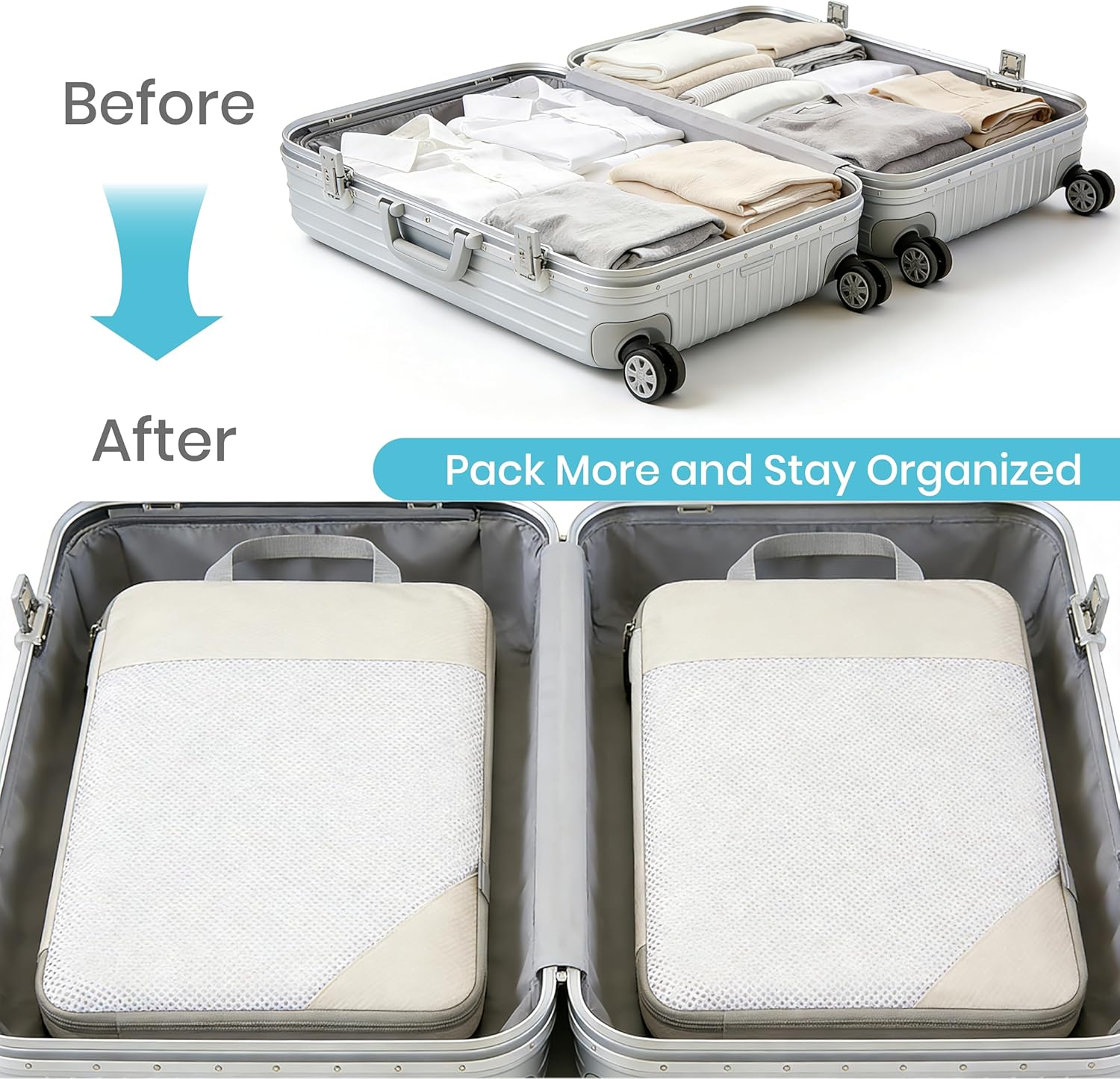 - High-Efficiency Compression Power: Utilizing advanced double-zipper compression technology, these cubes significantly reduce clothing volume—up to 50% less bulk—without requiring vacuum bags. This allows you to fit twice as much into your suitcase, saving space and improving packing efficiency.