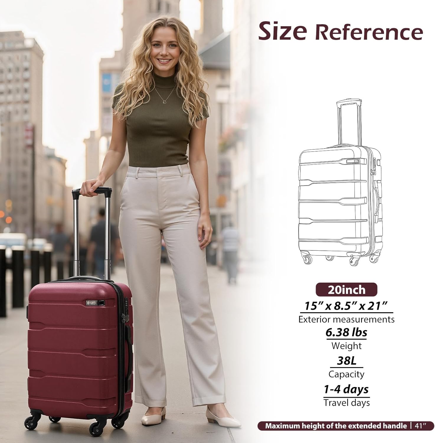【Airline Approved Size】 Measured 21x15x8.5 inches (including wheels), this 20in carry on luggage complies with the carry-on size restrictions of most major airlines worldwide. It can be easily stowed in the overhead bin, eliminating the hassle of checked luggage and saving you time on check-in and baggage claim. Ideal for weekend getaways, business trips, and international journeys, it’s your best companion for hassle-free travel