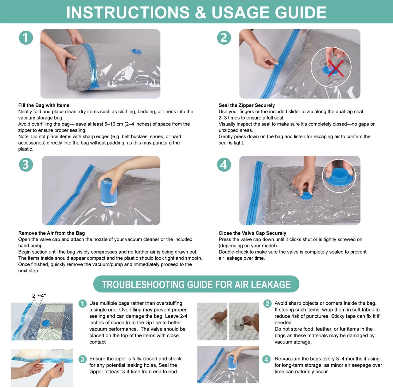 Fill the Bag with Items into the vacuum storage bag. Seal the Zipper Securely: use the included slider to zip along the dual-zip seal 2–3 times to ensure a full seal. Remove the Air from the Bag: Open the valve cap and attach the nozzle of your pump. Vacuum and Close the Valve Cap Securely.
