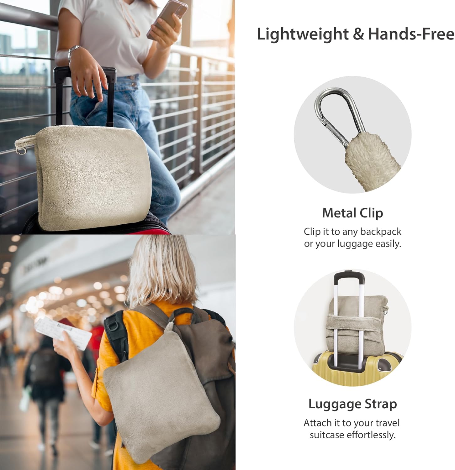 - Integrated Luggage Sleeve & Backpack Clip: Designed with real-world travel in mind, this blanket includes a built-in sleeve that slides easily over the handle of a rolling suitcase, keeping it secure and hands-free as you navigate busy terminals. The durable metal clip offers another layer of convenience, allowing you to attach the folded blanket to backpacks, diaper bags, or tote bags. This dual attachment system ensures your blanket stays with you—whether you’re rushing through an airport or hiking to a campsite.