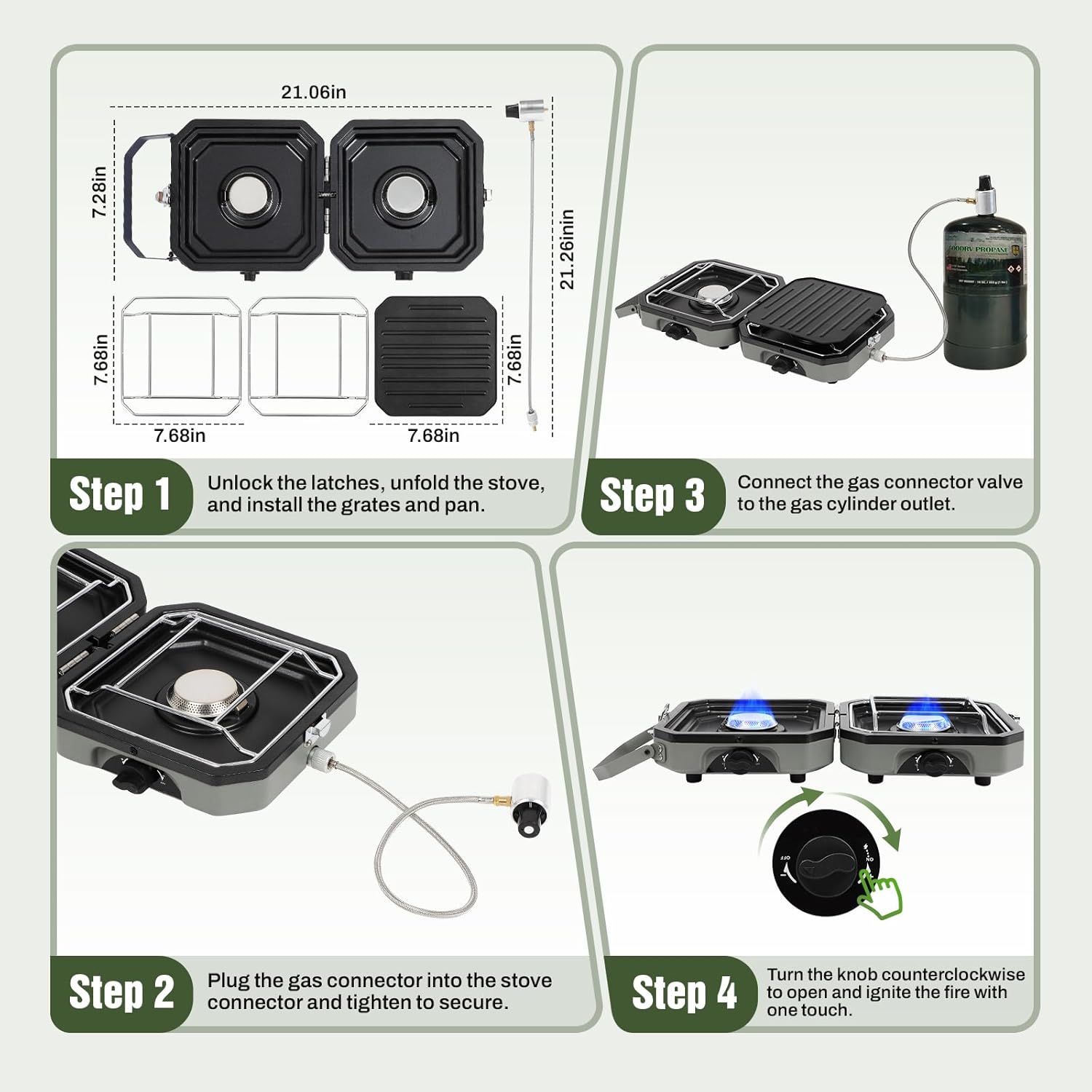- User-Friendly Setup: Assembly is straightforward: connect the gas tubing between the stove and a compatible propane bottle (not included), then ignite using the piezo knob. Individual control knobs allow precise temperature adjustment for everything from simmering to high-heat cooking.