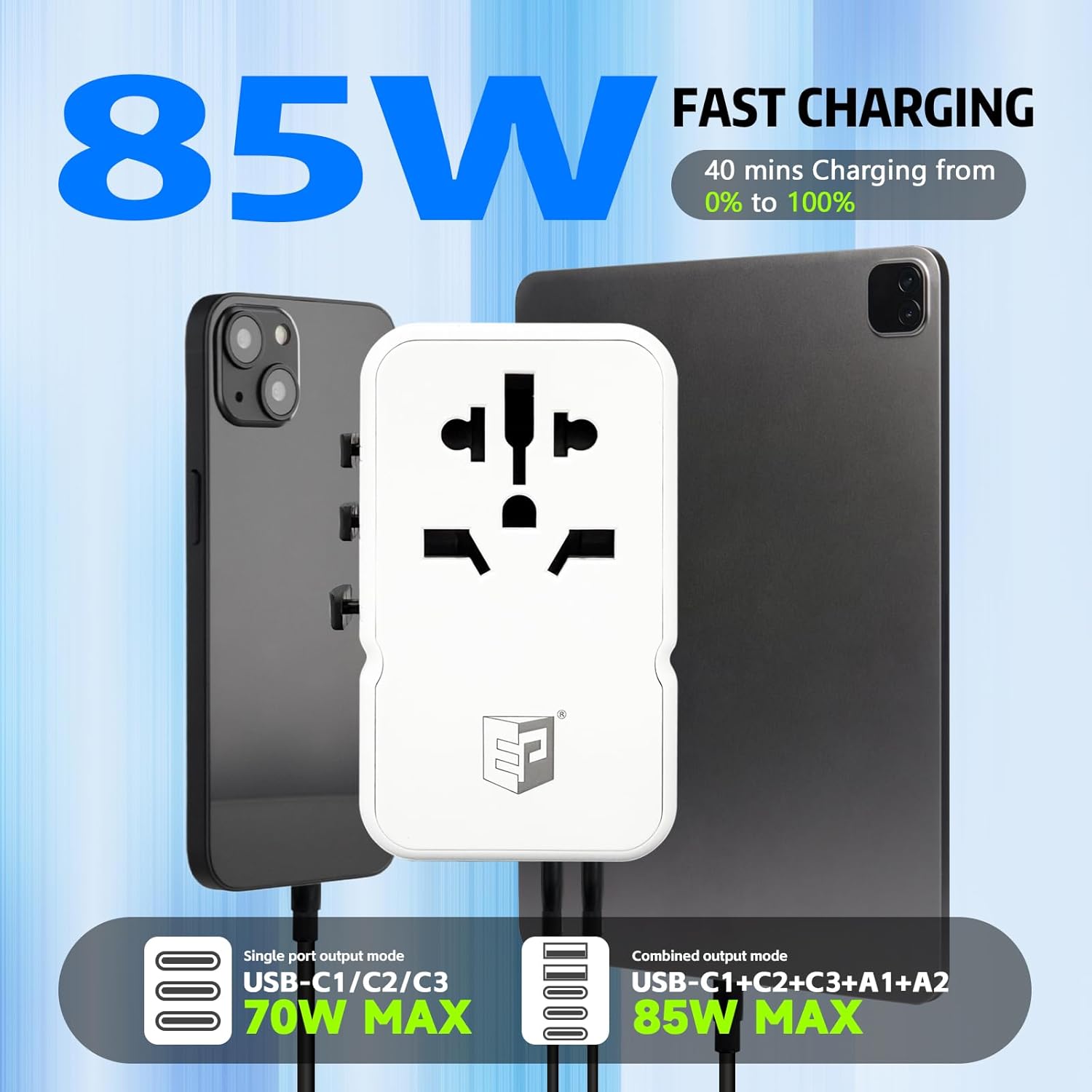 USB C Universal Plug Adapter – The 2 USB A ports can charge up to 2.4A, and the 3 USB C port can charge up to 3A, ideal for cell phone, tablet, laptop, camera, ect. All the USB ports output: 5V/3A, 85W max.