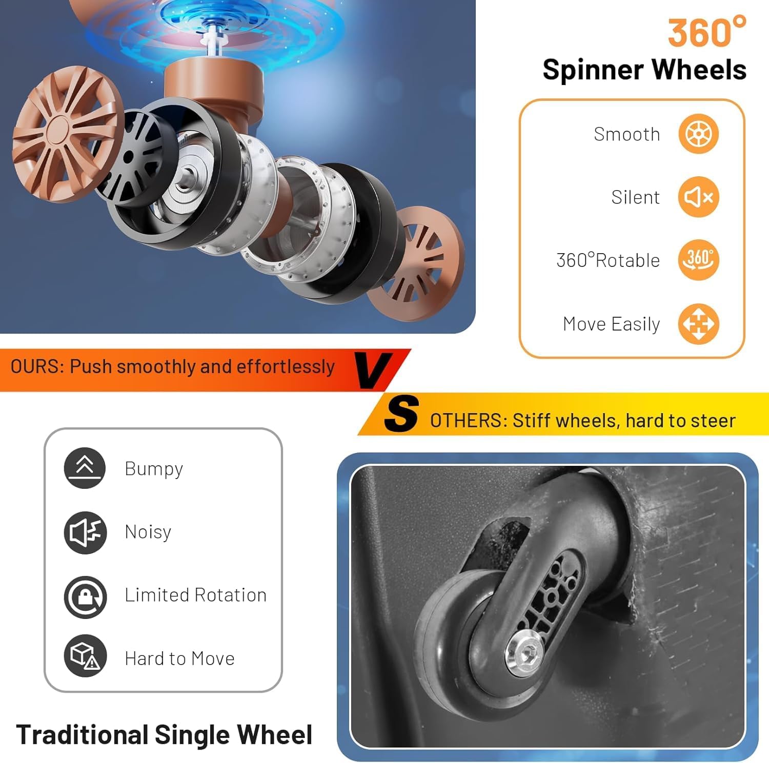 - 360° Spinner Wheels: Four low-noise dual-wheel casters provide silent, smooth rolling across all surfaces, reducing tipping and improving control in crowded spaces.