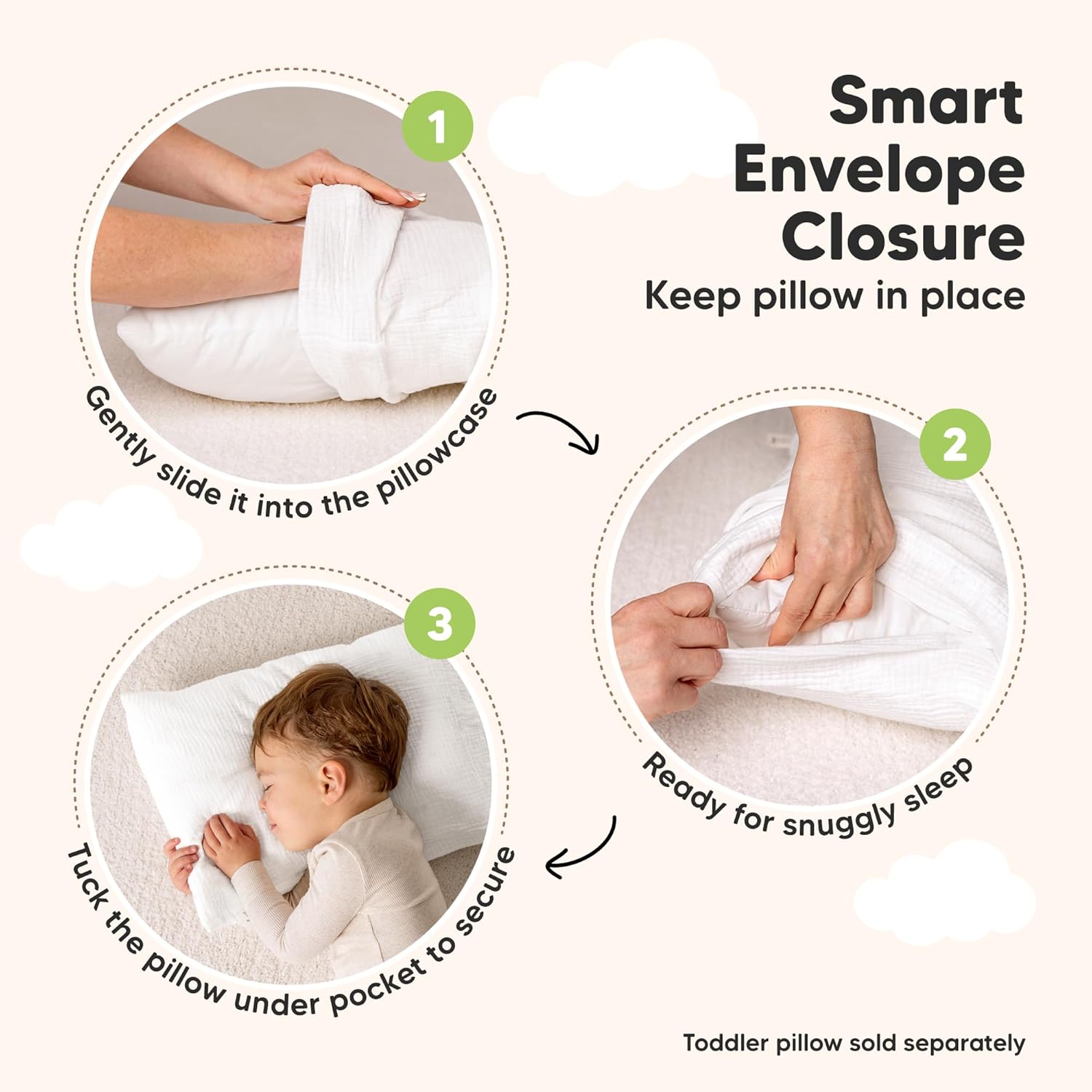 Material 100% Organic Cotton Muslin Pillowcase Age 2 to 5 years old, toddlers, kids, children Gender Unisex for boys and girls Fit 13 x 18″ Standard Size Toddler Pillows Skin Types All skin types, including dry and sensitive skin. Wash Care Machine washable and dryer-friendly. Avoid using bleach and softeners. Tumble dry low. Style Modern, contemporary, gender neutral What’s Included Pillowcase only | 13×18″ Toddler pillow sold separately Feature Smart envelope closure keep pillow in place, slide-proof Pack Available in 1-pack and 2-pack