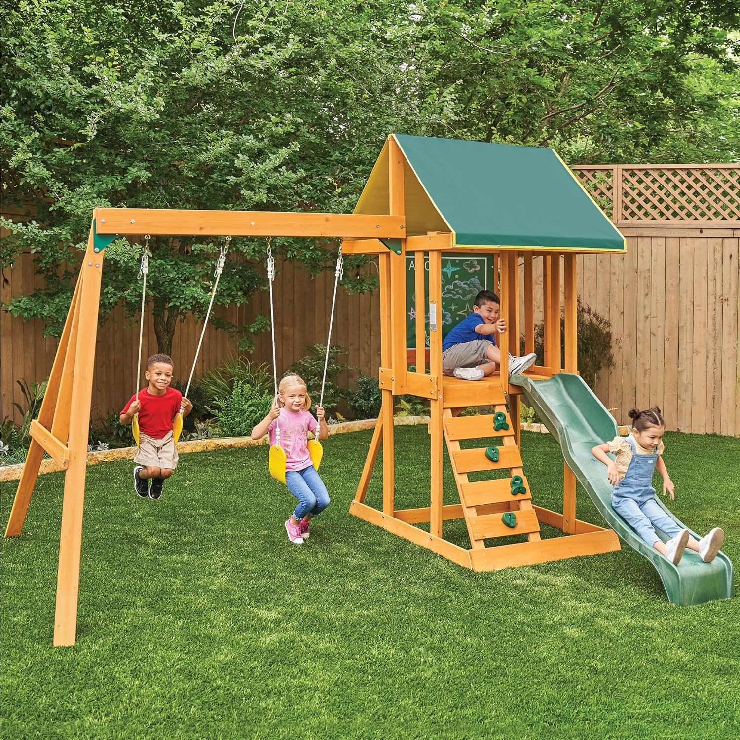The Appleton Swing Set by KidKraft is perfect for small spaces. With a compact footprint of just 80 sq. ft., Appleton packs miles of fun into every well-crafted inch—accommodating up to six lively kids. Starting with an exhilarating high-rail wave slide, the adventure continues with a quick scramble up the rock wall ladder to the shade of the gable-roofed upper deck. There, enclosed by protective side slats, children can safely draw or write on the vinyl chalkwall, survey their magic kingdoms or just sit and play. Outside, a trip to the sandbox for archaeological digs or a ride on one of the two sturdy belt swings provides plenty of fresh air activity. Adults will appreciate the high-quality, 100% premium wood construction and ease of assembly. Appleton is one small wonder that packs a big punch. For children aged 3 years to 7 years.