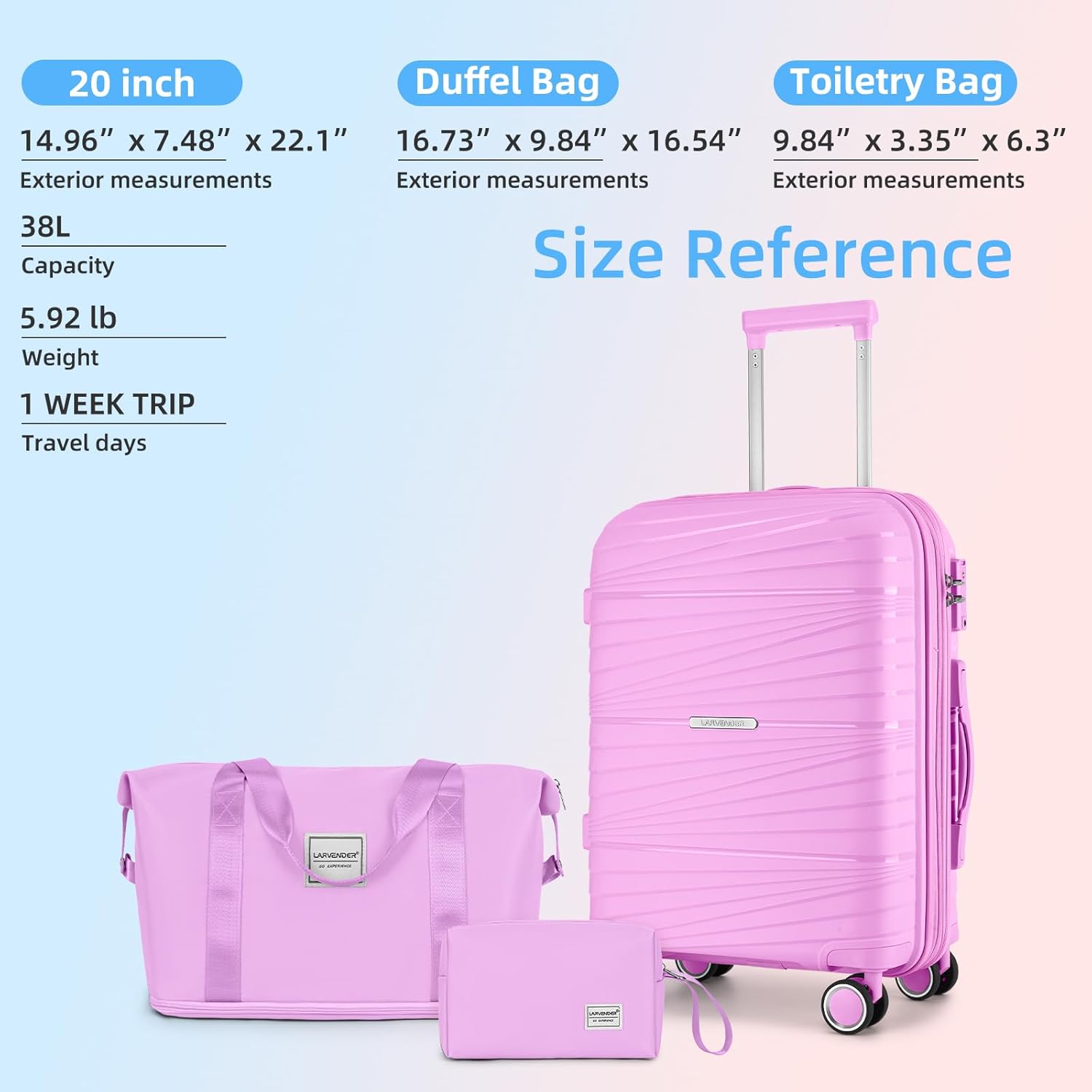 Luggage Sets 3 Piece: The 3-piece luggage set includes a 20-inch carry-on suitcase, a travel duffel bag, and a toiletry bag. The 20-inch suitcase is ideal for short trips or as a carry-on option, meeting most airline size restrictions to help you avoid checked baggage fees. Additionally, the duffel bag features a 30% expandable capacity for extra space when needed, while the toiletry bag offers compact and convenient storage for your grooming essentials