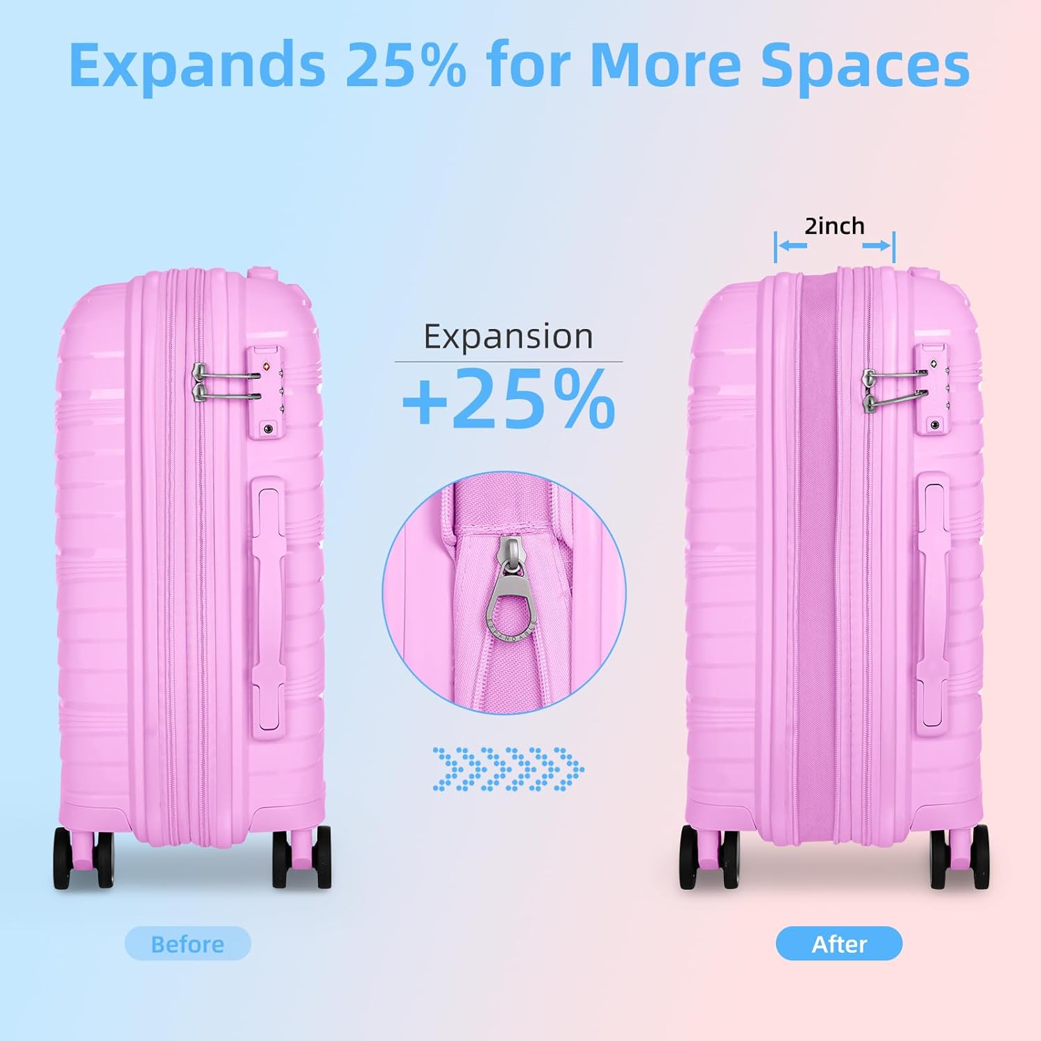 Sturdy PP Material: The 20-inch luggage set is crafted from 100% polypropylene (PP) hardshell, providing exceptional durability against abrasion and scratches for long-lasting reliability