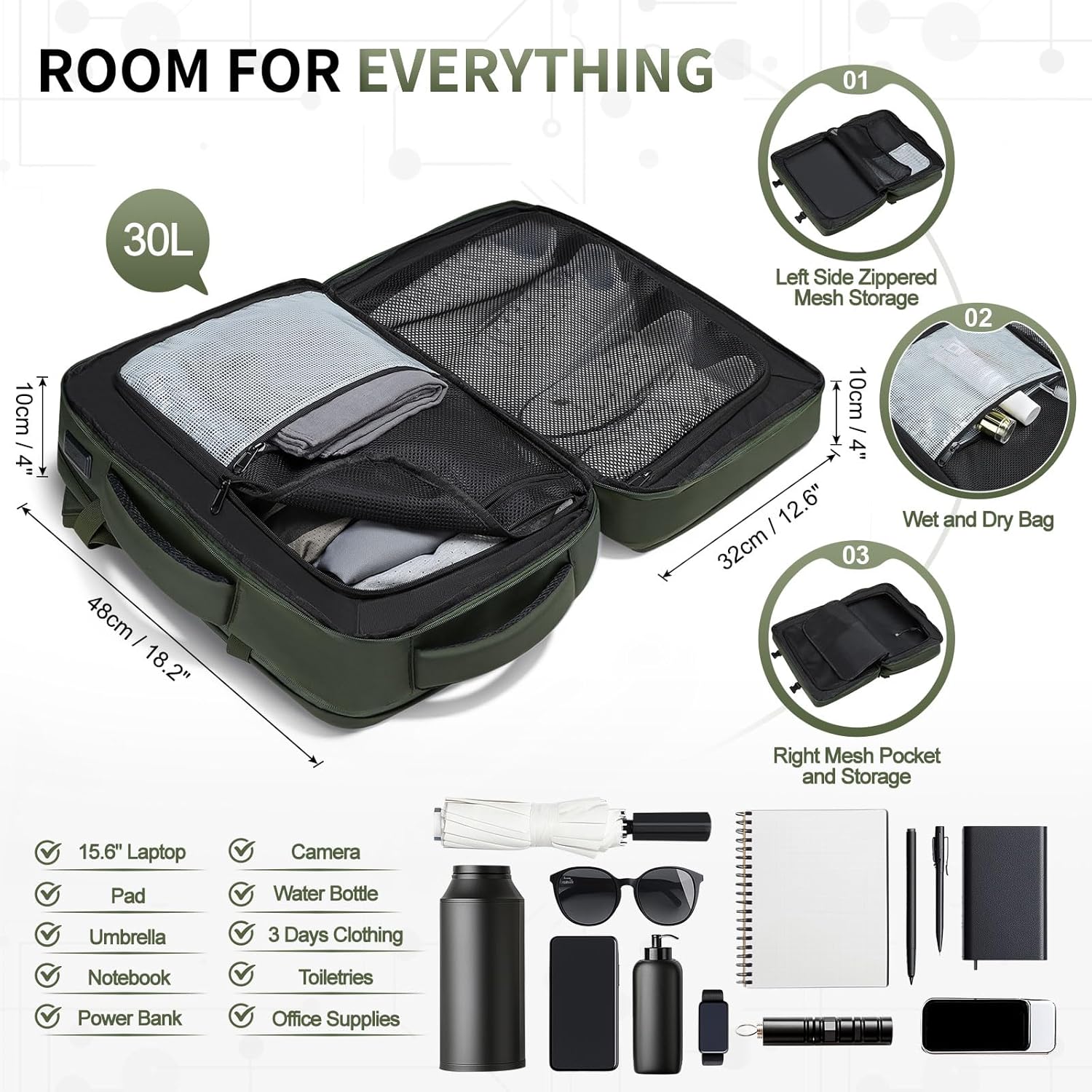 - Package Contents: Your purchase includes only the Lay Flat Travel Backpack in green. Accessories such as power banks, chargers, or packing cubes are sold separately.