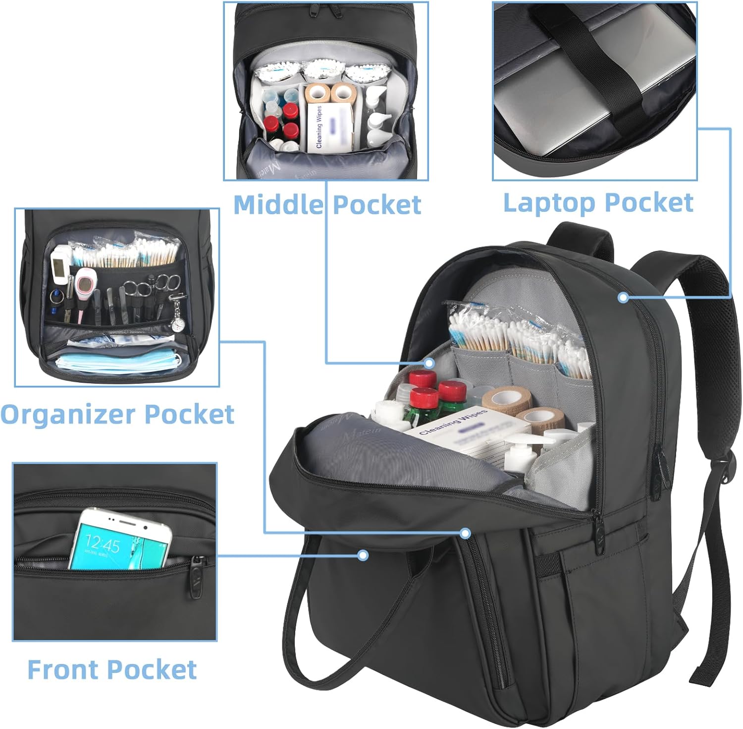 This product is designed for individuals working in mobile or clinical environments where reliability and organization matter. While the backpack is water-resistant and effective against light rain and spills, it should not be submerged in water. Always ensure all zippers are fully closed before exposure to moisture. If the included removable organizer comes into contact with bodily fluids or chemicals, follow manufacturer guidelines for cleaning. No additional medical accessories are included unless explicitly stated. The backpack is sold as a single unit and does not come with external warranties or guarantees beyond standard retail policies.