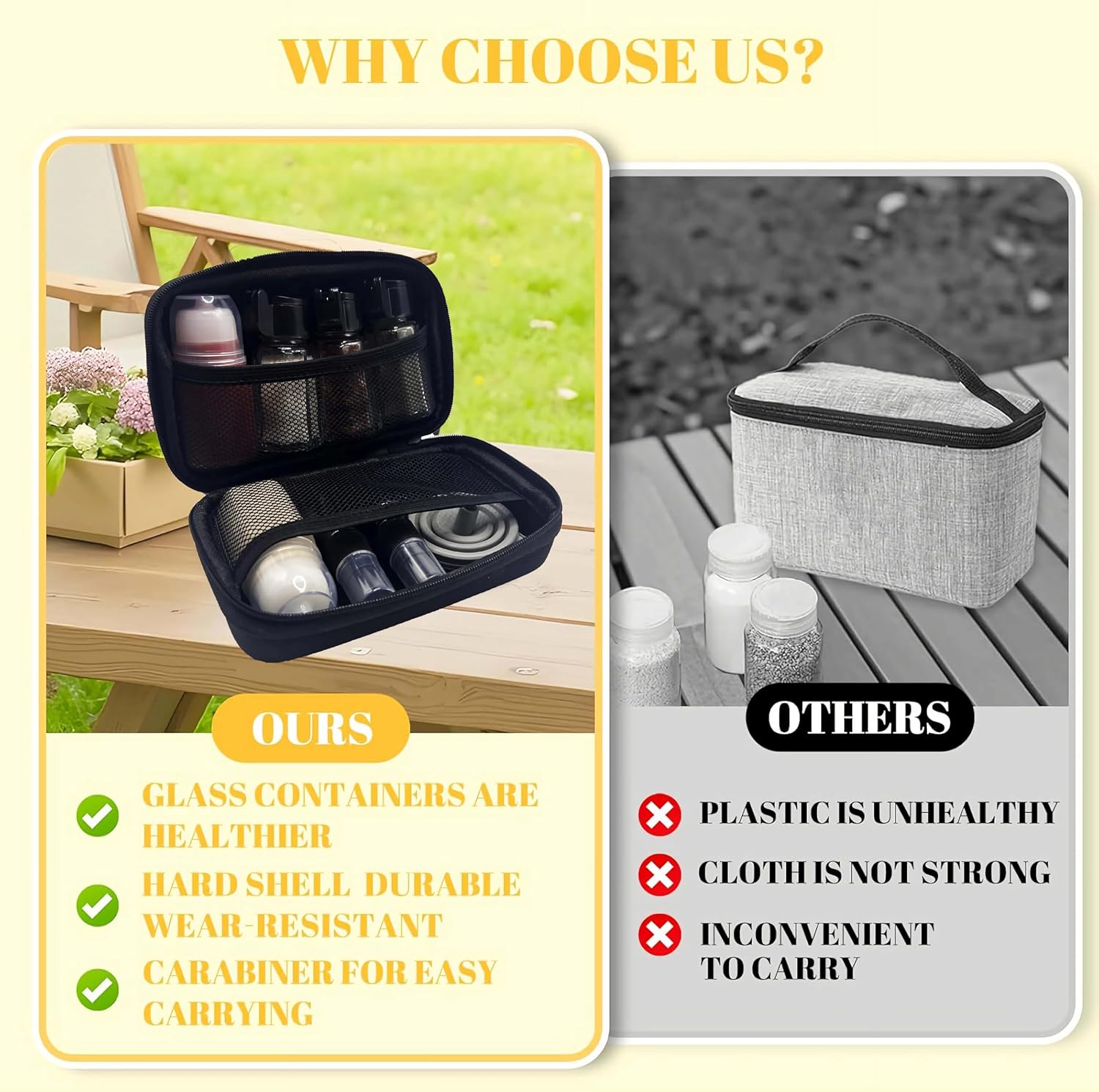 The product does not include any cleaning tools or accessories beyond the containers and organizer bag. Users should ensure thorough rinsing before first use and after each refill to maintain hygiene. Since the exact volume and size of individual containers are not detailed, users may need to test refill frequency based on usage intensity. This set is intended for personal use and may not be suitable for commercial kitchens due to its compact nature.