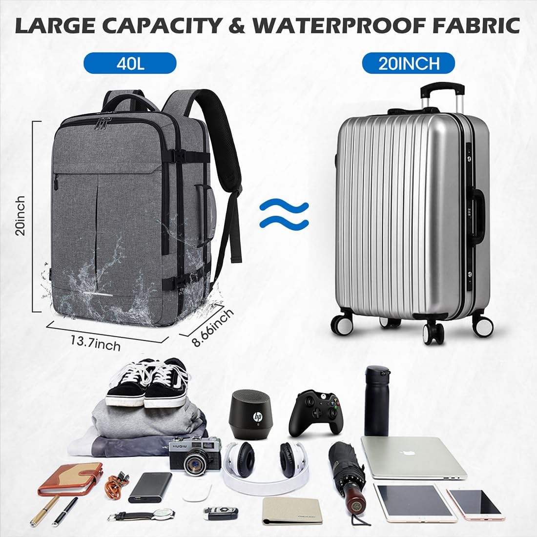 ✈【Flight Approved Travel Backpack】40L travel backpack meets airline carry-on requirements, suitable for placing on the top or under the seat in flights as personal item. 0-180 degrees opening zipper helps you pass through the security check quickly, and built-in elastic bands keep your clothes from falling out. (Size: 35 x22 x 51 cm/13.77x 8.66 x 20.07 inches ; Weight : 2.8LB)