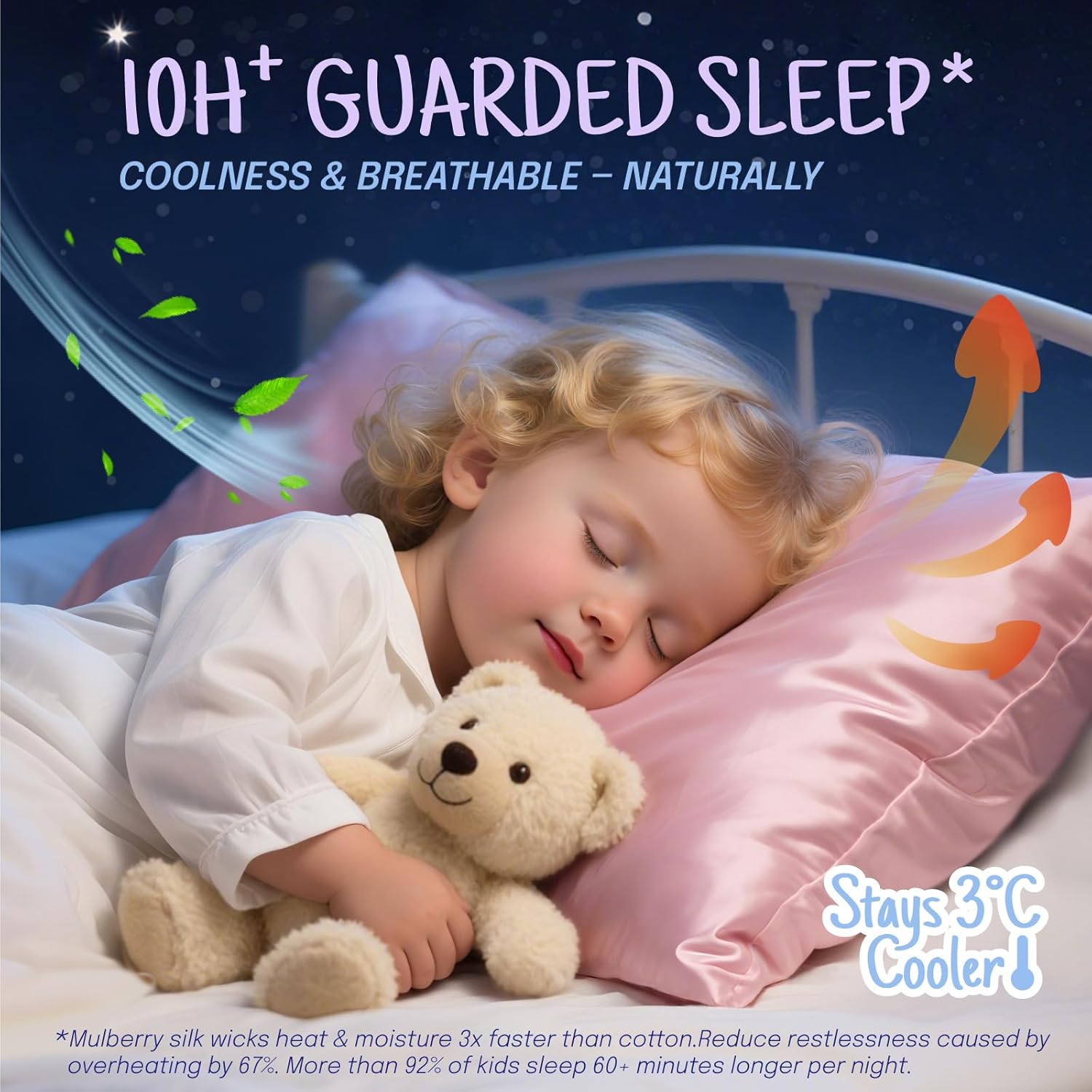 - Superior Breathability Over Cotton: Thanks to its unique fiber structure, mulberry silk allows better air circulation than traditional cotton fabrics. This means your child stays cool in hot weather and doesn’t overheat in milder conditions—while also wicking away excess moisture to keep the scalp dry and comfortable throughout the night.
