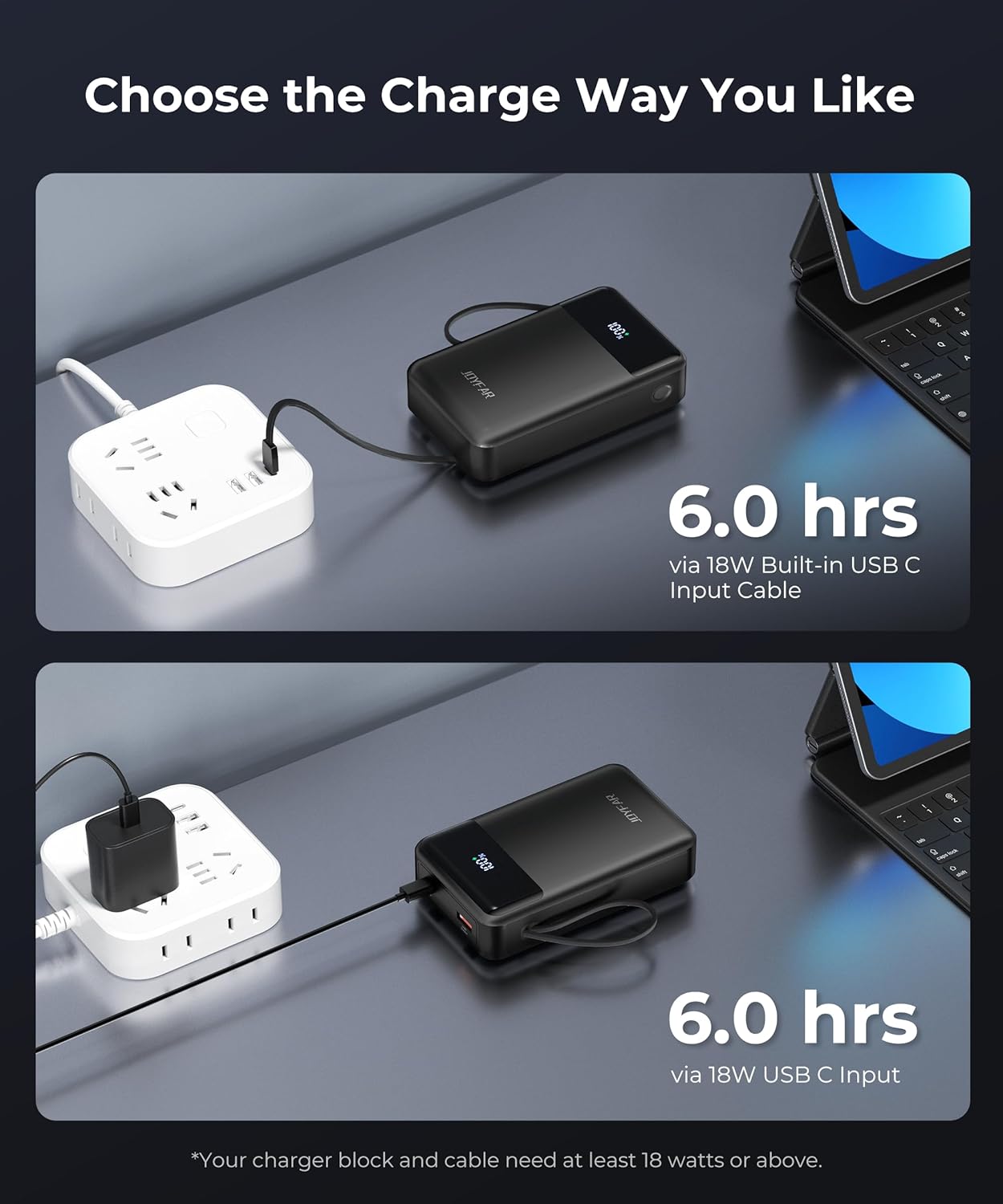 - What’s Included: 1 x JOYFAR 30,000mAh power bank, 1 x user manual, 1 x 0.98 ft USB-A to USB-C charging cable. Note: Wall adapter/charger block is not included.