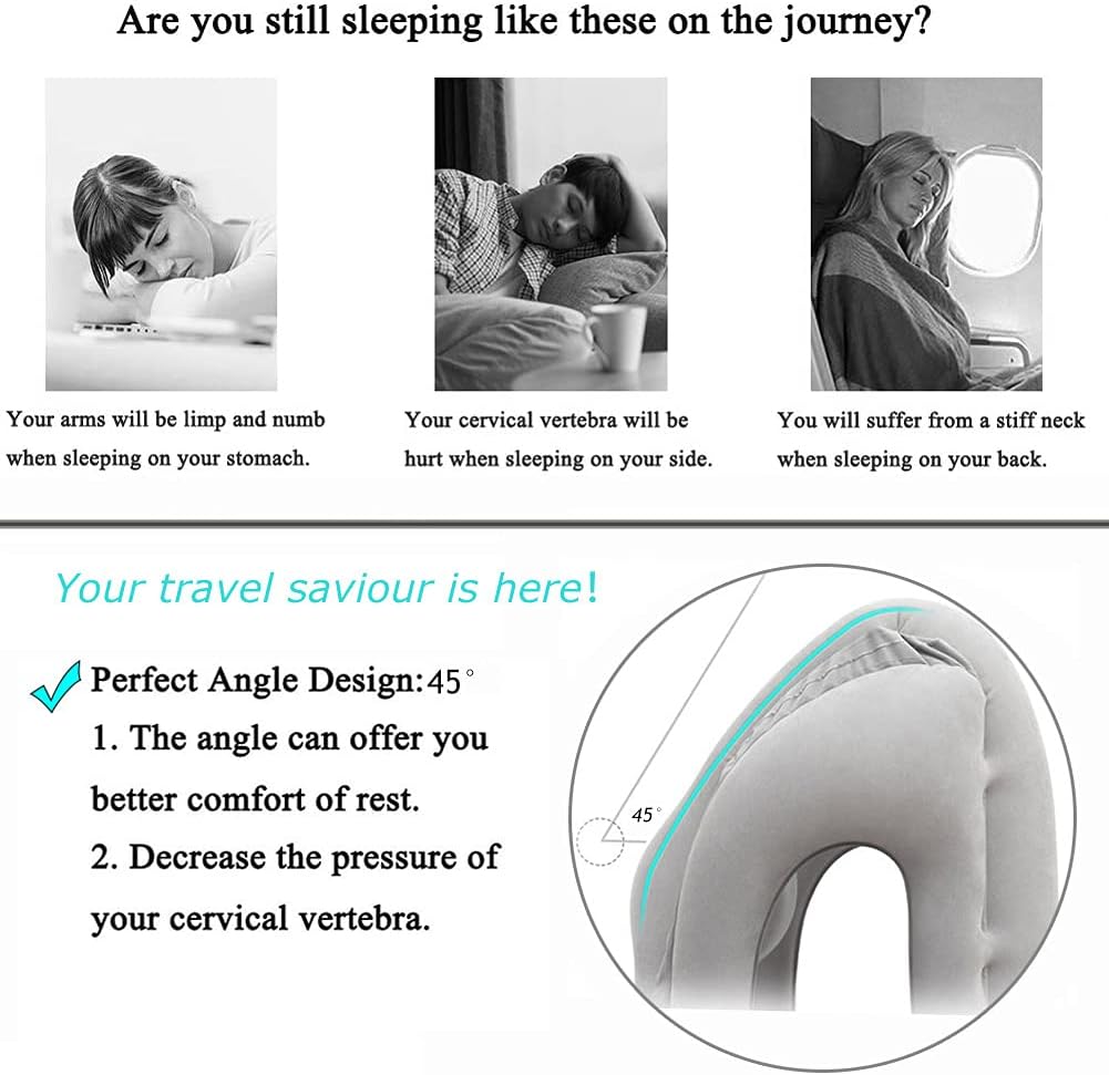 Get rid of pain and bad posture: Poor posture can cause cervical damage and damage the sciatic nerve and coccyx. According to reasonable ergonomic principles, we define the neck pillow as a pillow that not only wraps around the neck, but also maintains the correct relationship between the head, neck and shoulders during sleep. This inflatable travel neck pillow can help you avoid injury and insomnia.