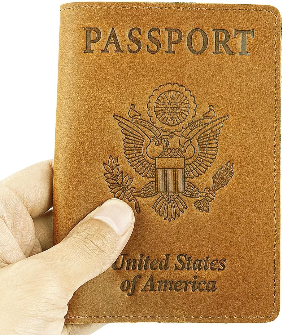 The AGBIADD RFID Blocking Passport Holder in Brown is a premium travel wallet designed for frequent travelers who value security, durability, and timeless style. Crafted from thick, genuine cowhide leather with reinforced stitching, this passport holder offers long-lasting protection for your essential documents. Its slim profile fits comfortably in pockets or bags without adding bulk, making it ideal for both business trips and leisure travel. The built-in RFID blocking technology shields credit cards, passports, and IDs from unauthorized scanning, helping prevent identity theft. With a classic design featuring the United States Great Seal embossing, this holder combines functionality with elegant craftsmanship.