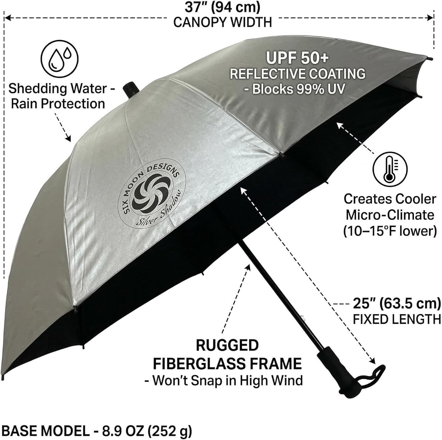 The Six Moon Designs Silver Shadow Hiking Umbrella is a purpose-built trekking essential for outdoor adventurers who face relentless sun, sudden storms, or both—often in the same day. Originally designed to address the limitations of traditional hiking gear, this umbrella redefines personal weather protection with its innovative dual-surface canopy and rugged, minimalist construction. Whether you’re walking through scorching deserts, crossing high-altitude trails, or navigating unpredictable mountain weather, the Silver Shadow delivers reliable coverage without compromising on weight or durability. Engineered with thru-hikers, PCT trekkers, and desert travelers in mind, it offers a perfect balance of sun defense, rain resistance, and compact portability.