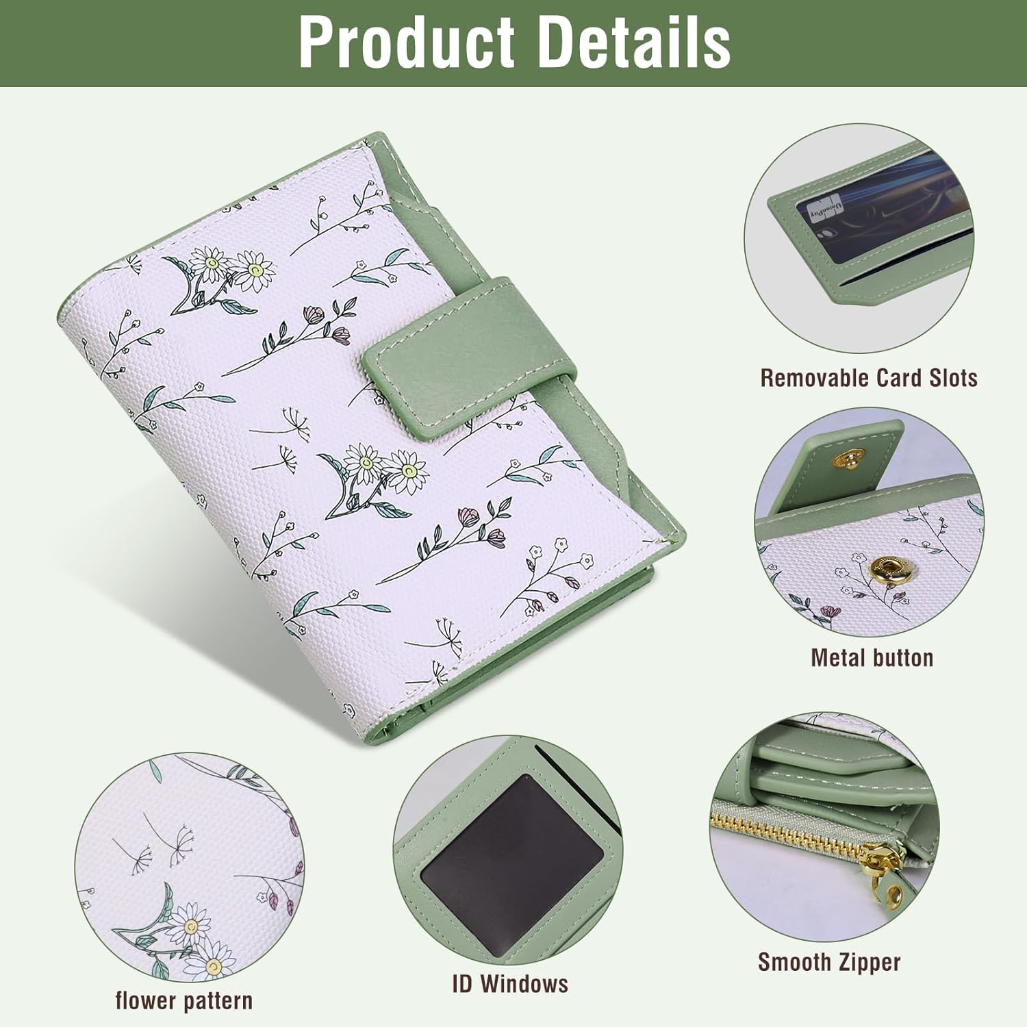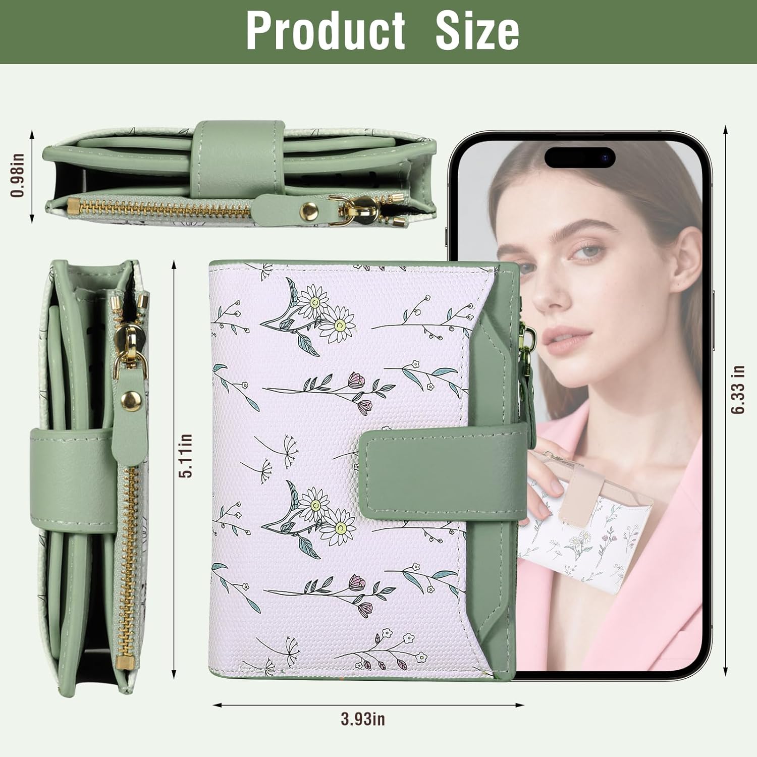 - Elegant Floral Print Design: Adorned with a charming floral pattern in green tones, this wallet adds a touch of sophistication and personality. Its stylish aesthetic complements both casual and dressy outfits, making it suitable as a thoughtful gift for friends, family, or yourself.