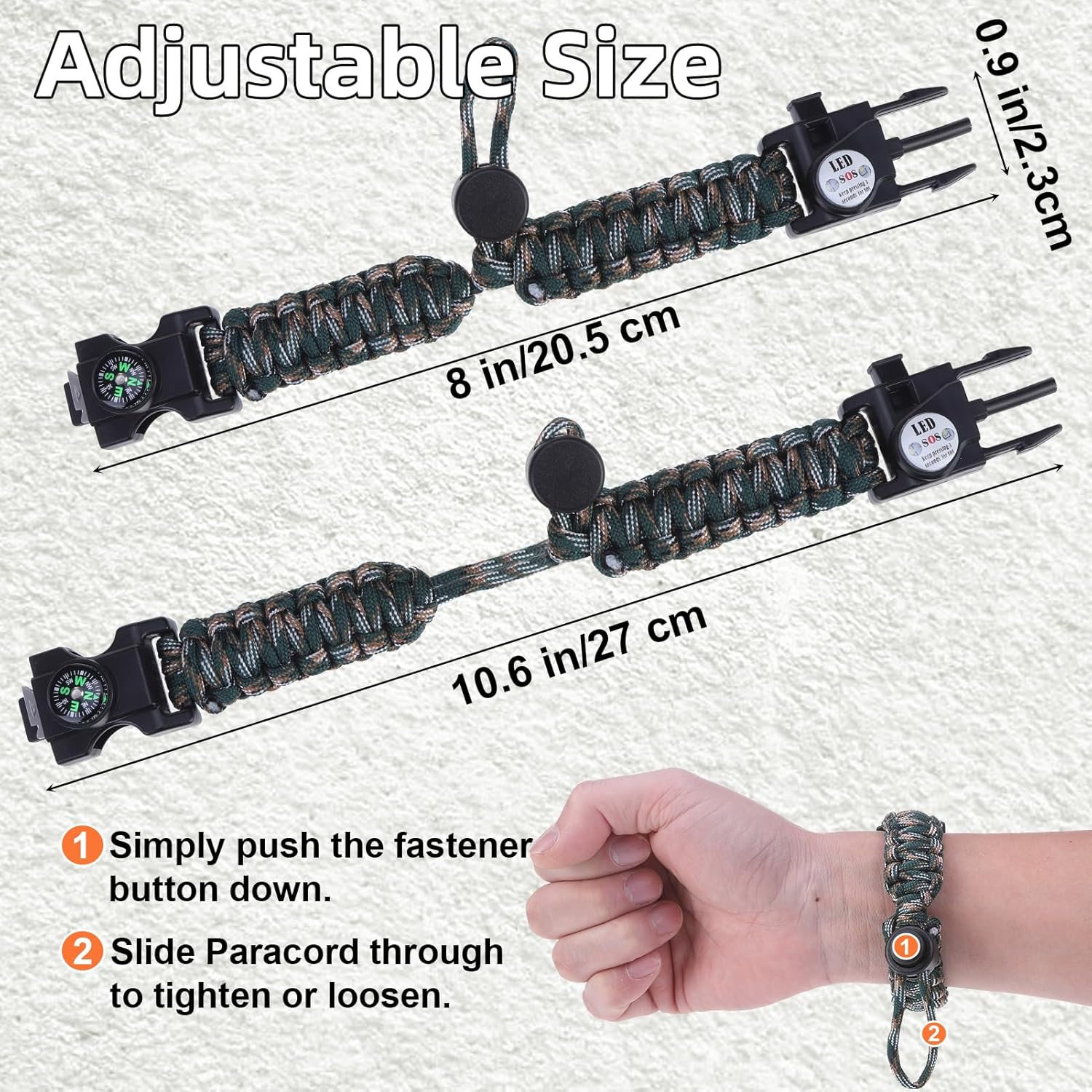 Designed for outdoor adventurers who value preparedness and reliability, these survival bracelets combine essential emergency tools into a single, wearable format. Made from military-grade 550 paracord—the same material used in parachute lines—each bracelet integrates a loud whistle, fire-starting flint, and a built-in compass, all within a compact and adjustable design. The set includes two bracelets, providing redundancy so you’re never without critical gear during camping trips, hiking expeditions, fishing excursions, or hunting adventures.