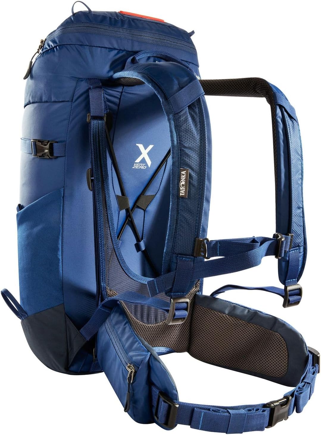 The X Vent Zero carrying system developed by the German outdoor brand Tatonka does not use a mesh back, so that the hiking backpack is only minimally on the back. So sweat moisture can evaporate optimally. With padded, ventilated shoulder straps, ventilated hip and adjustable chest strap, the touring backpack is comfortably fixed.
