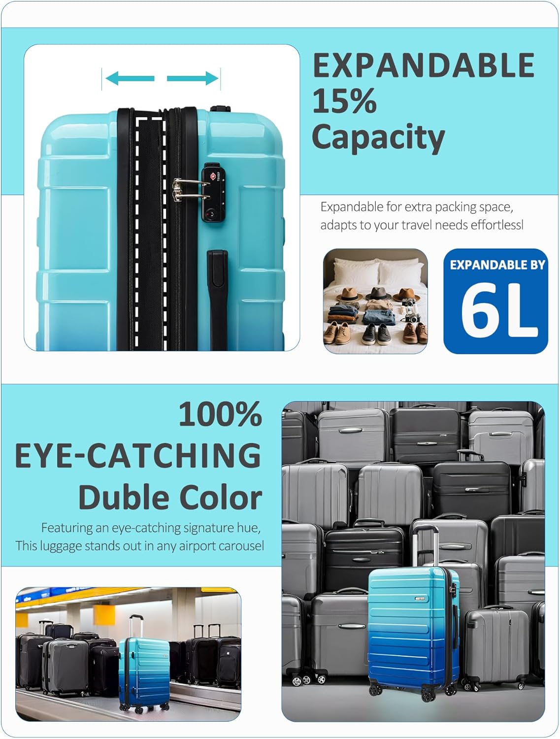 - Durable PC+ABS Shell: Constructed from high-quality polycarbonate (PC) combined with acrylonitrile butadiene styrene (ABS), the outer shell delivers exceptional strength while keeping the overall weight low. This composite material resists impacts, scratches, and general wear from rough handling common at airports. Even under demanding conditions, the shell maintains its shape and structural integrity, protecting your belongings throughout your journey.