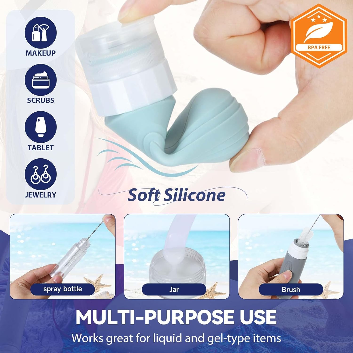 【10PCS TRAVEL TOILETRIES CONTAINERS】This 10 Pack Travel Bottles for Toiletries includes 2 big silicone travel bottles(3OZ/90ML), 2 small silicone travel bottles(2OZ/60ML), 4 travel jars(0.3OZ/10ML), 2 spoons, 1 funnel, 1 cleaning brush, 1 printed label, and 1 clear zipper bag. It’s a one-size-fits-all solution for your travel essentials