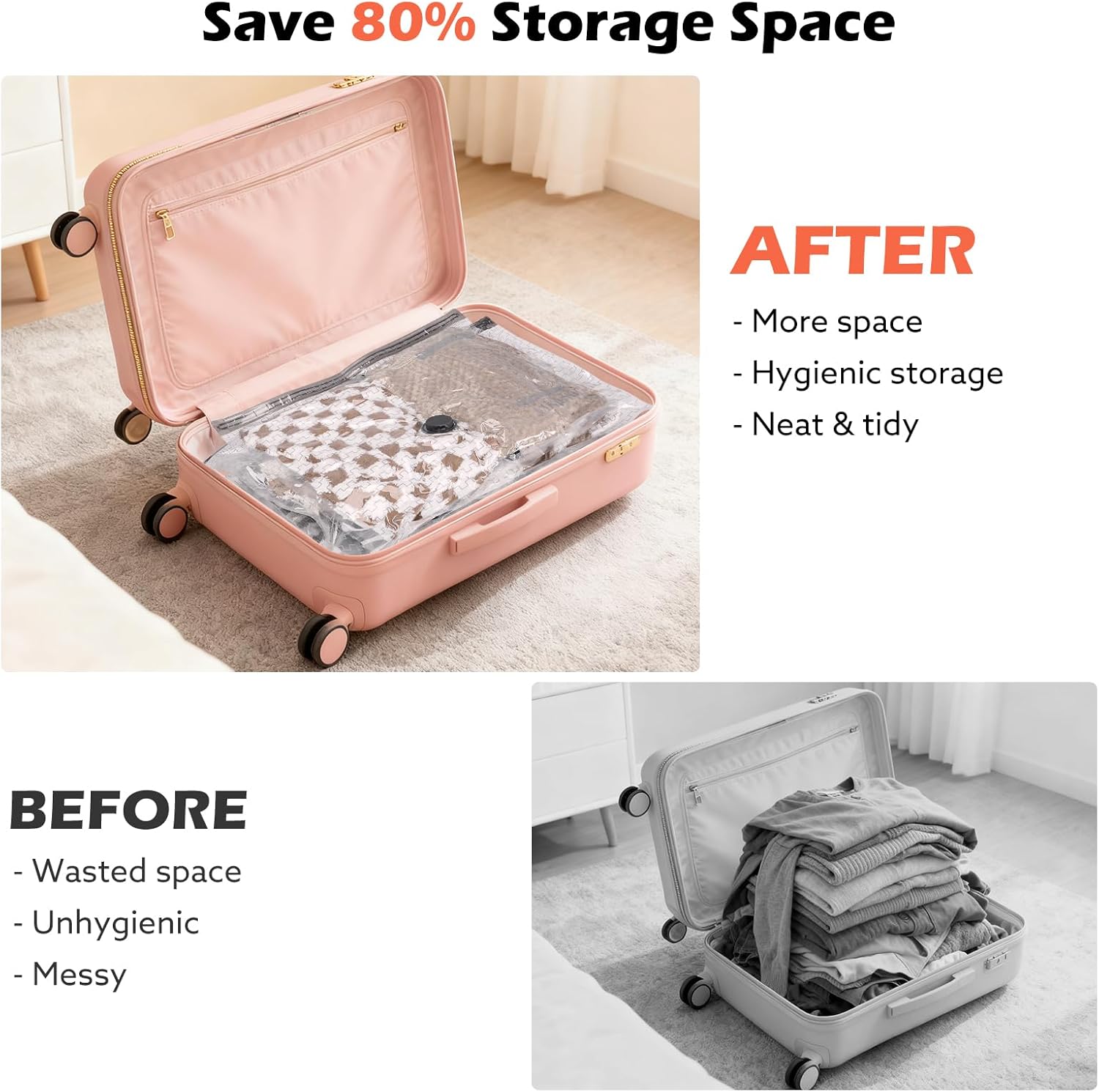 • Up to 80% Space Savings: By removing excess air from soft, bulky items, these bags dramatically reduce volume—making suitcase packing more efficient, reducing baggage fees, and freeing up valuable closet or drawer space at home.