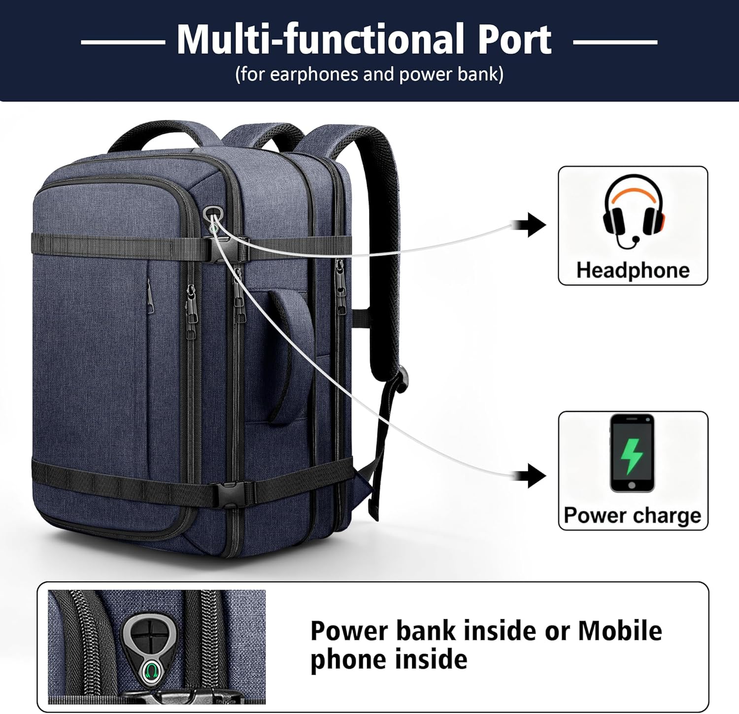 Please note that this backpack does not include a built-in power bank. To use the USB charging function, you must supply your own portable charger separately. Always confirm carry-on size restrictions with your specific airline before flying, as regulations can vary. When expanding the main compartment, avoid overloading to maintain stability and prevent zipper strain. The package includes only the backpack itself; no additional accessories such as packing cubes, power banks, or straps are provided unless listed separately.