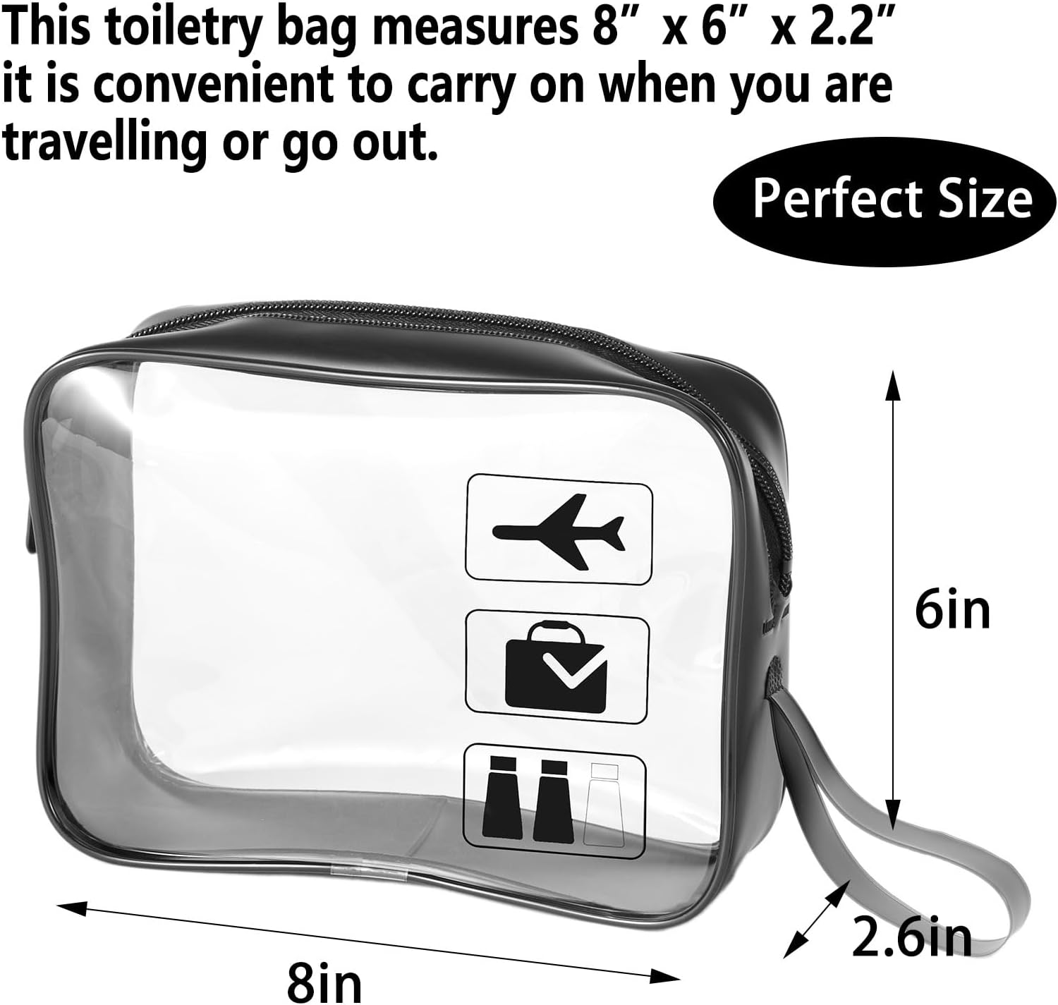 TSA 3-1-1 Approved – large: 8 x 2.6 x 6 inch. Clear toiletry bags fully comply with TSA 3-1-1 liquid rules for all airline carry-on baggage