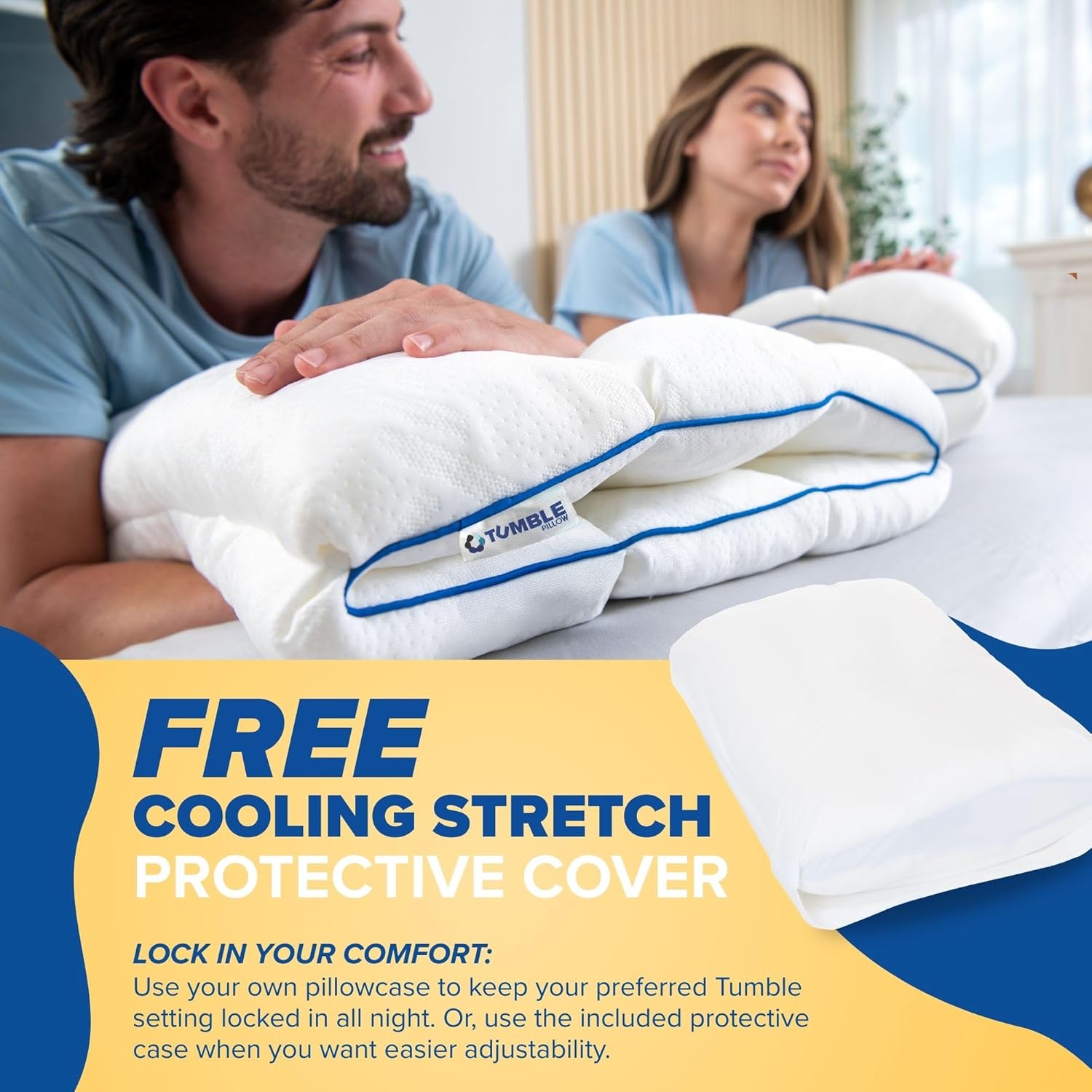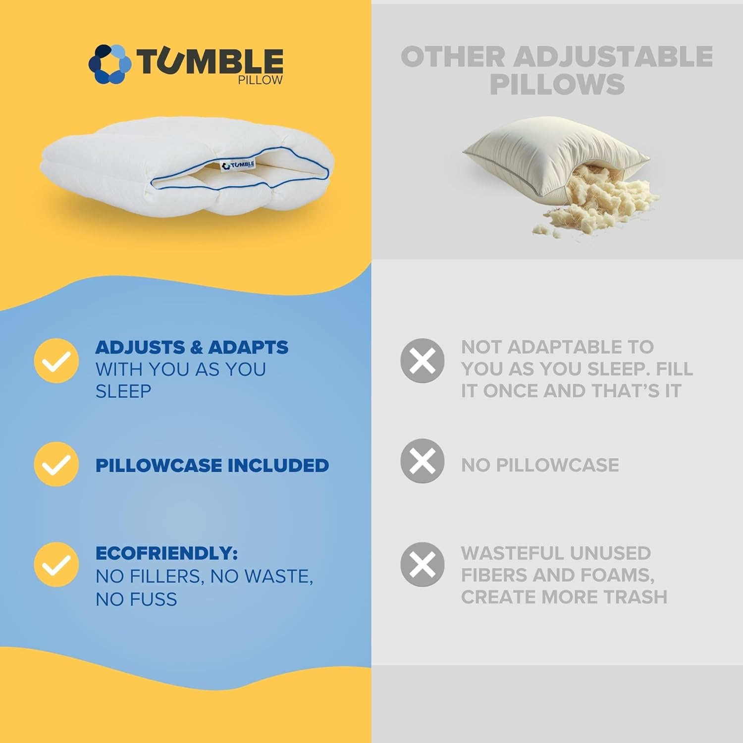 TUMBLE 6-Chamber Adjustable Bed Pillow | Back, Side &Tumble Background Header A+ Brand StoryTumble Background Header A+ Brand StoryAbout Tumble Pillow and Bedding: Everyone deserves a pillow that actually fits them.About Tumble Pillow and Bedding: Everyone deserves a pillow that actually fits them.What's a Tumble PillowWhat's a Tumble PillowHow to find your comfort code with Tumble PillowHow to find your comfort code with Tumble PillowTumble Pillows are recommended by doctors.Tumble Pillows are recommended by doctors.Her Comfort Code To Great SleepHer Comfort Code To Great SleepHis Comfort Code To Great SleepHis Comfort Code To Great SleepFree Cooling Pillowcase with all tumble pillow ordersFree Cooling Pillowcase with all tumble pillow ordersThe Last Pillow You'll Ever Need, Tailor Your Sleep ExperienceThe Last Pillow You'll Ever Need, Tailor Your Sleep ExperienceOur pillow is not going to make you cool but it will keep you coolOur pillow is not going to make you cool but it will keep you coolOur pillow is not for sumo wrestling, our pillow is not for everything, but it is for everyoneOur pillow is not for sumo wrestling, our pillow is not for everything, but it is for everyoneTumble Pillow Lifestyle Image Karate KickTumble Pillow Lifestyle Image Karate KickTumble Steps to Great SleepTumble Steps to Great SleepDiscover Tumble with our two pack pillow bundleDiscover Tumble with our two pack pillow bundle