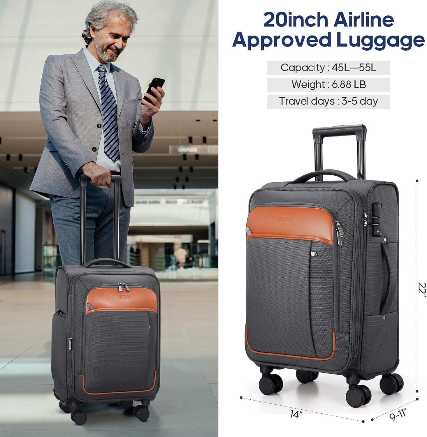 The UKEIN Expandable Carry On Luggage is a 20-inch softside suitcase designed for travelers who value airline compliance, smart organization, and durable performance. Ideal for men and women on domestic or international trips, this carry-on meets most major airline overhead bin requirements with its compact 22x14x9 inch dimensions. It combines expandable storage, thoughtful interior layouts, and secure mobility features to support stress-free travel.
