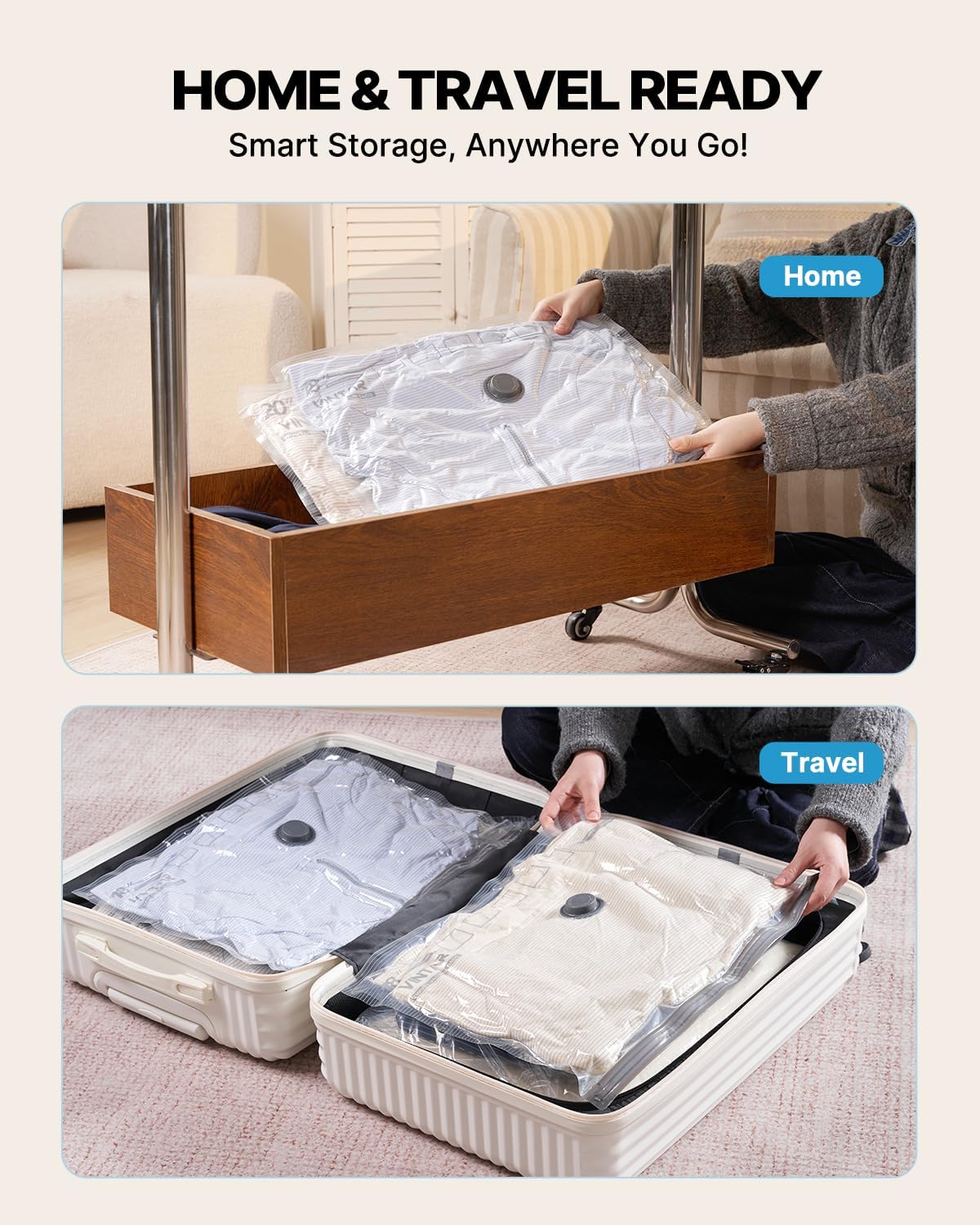- Up to 80% Space Reduction: Say goodbye to overstuffed suitcases and cramped closets. These compression bags shrink bulky garments and linens by up to 80%, giving you significantly more room for travel essentials, seasonal items, or everyday clothing. Ideal for frequent flyers, campers, students, or homeowners managing changing seasons.