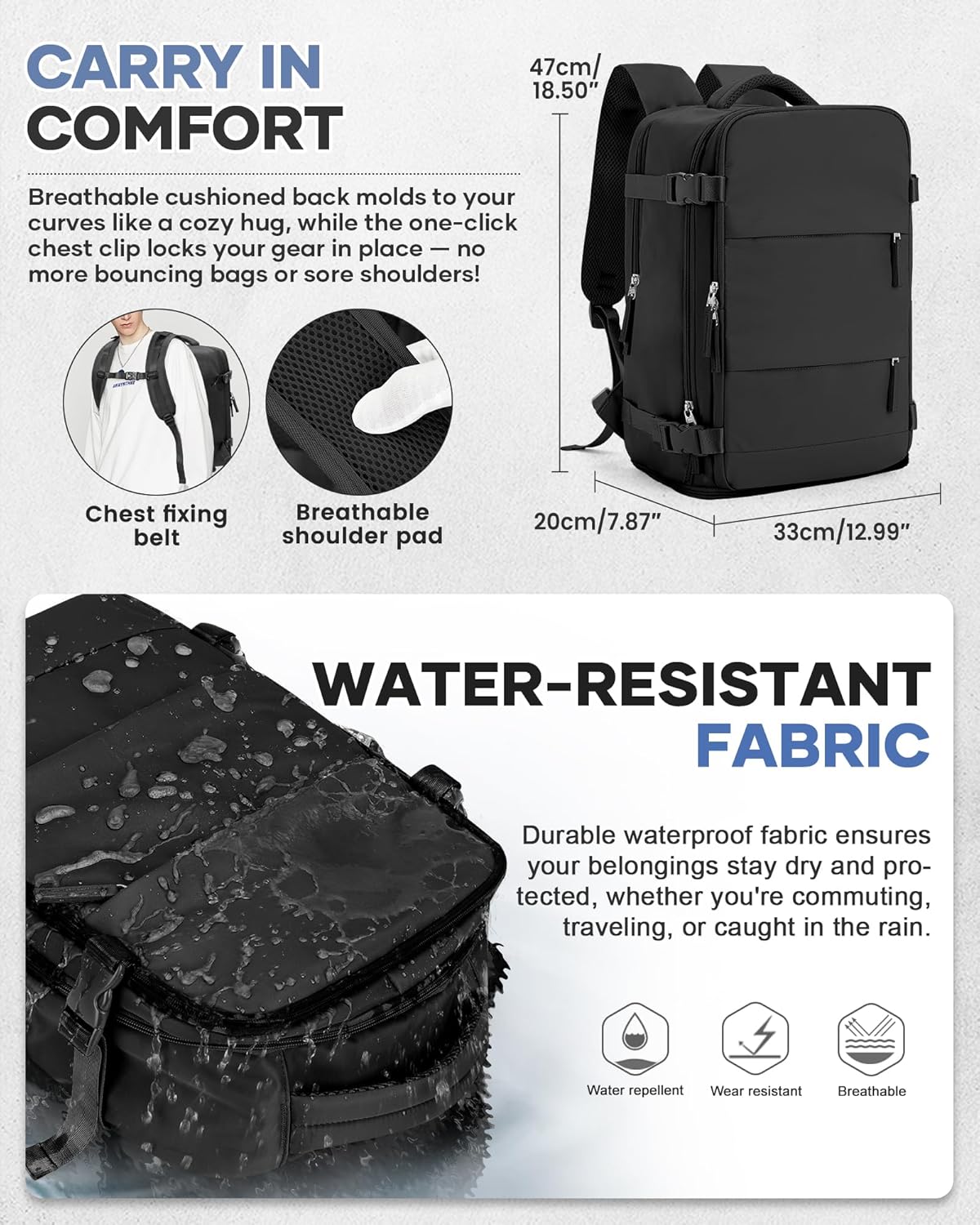 💎 Multi-Functional Design – Meticulously crafted for business trips, workouts, and daily commutes. Features a smart compression system with multi-functional inner pockets in the main compartment, plus a front quick-access pocket for essentials. The ventilated back panel effectively reduces carrying strain, while the water-repellent exterior safeguards your belongings from the elements.