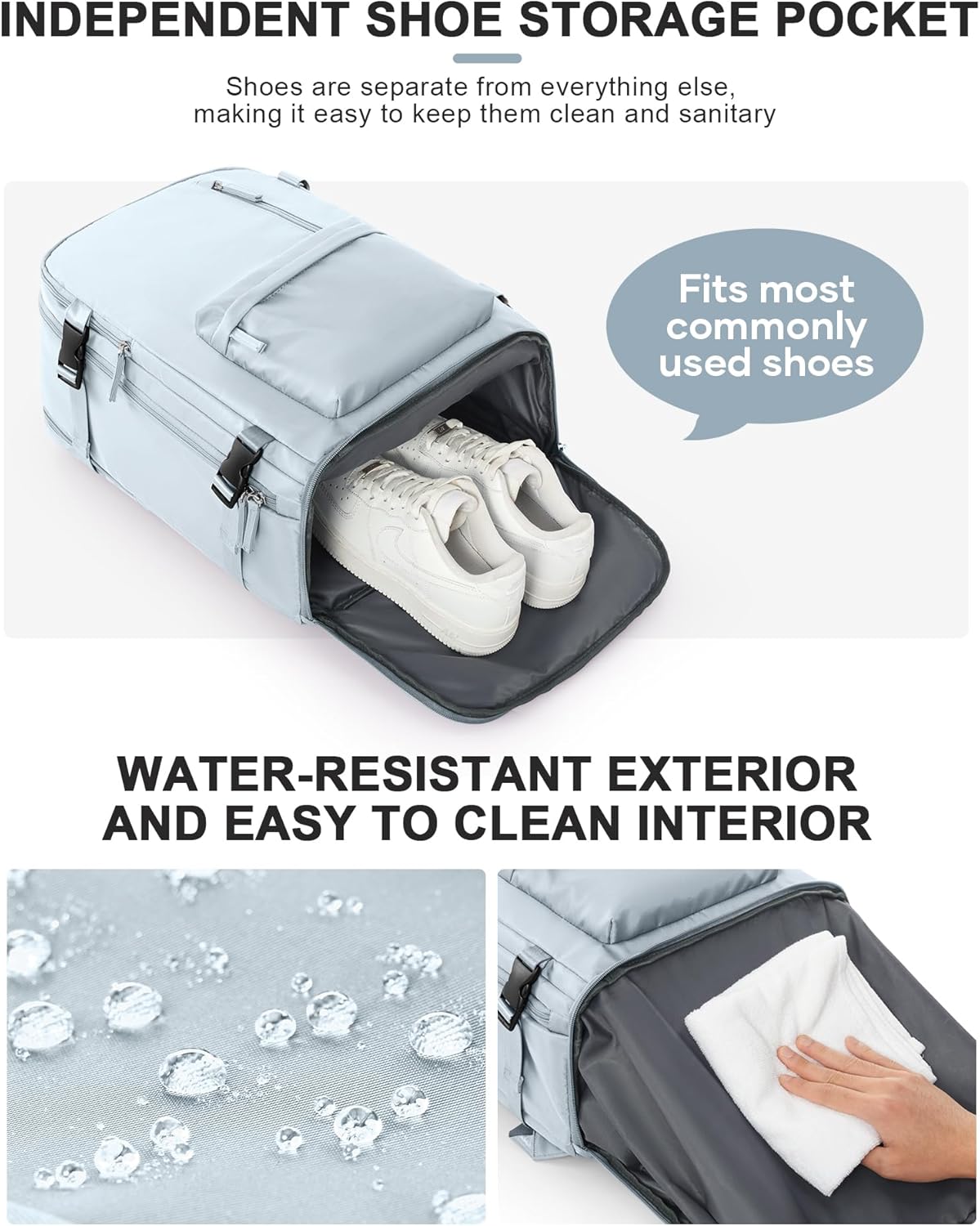 - Separate Shoe Compartment & Wet Pocket: The bottom section includes a dedicated shoe compartment that isolates footwear from clean clothes, preventing dirt or odors from contaminating your other belongings. Even better, the front wet pocket uses high-density, leak-resistant material—ideal for damp towels, swimwear, gym clothes, or post-trip laundry—ensuring wet items stay contained and dry others safe from moisture.