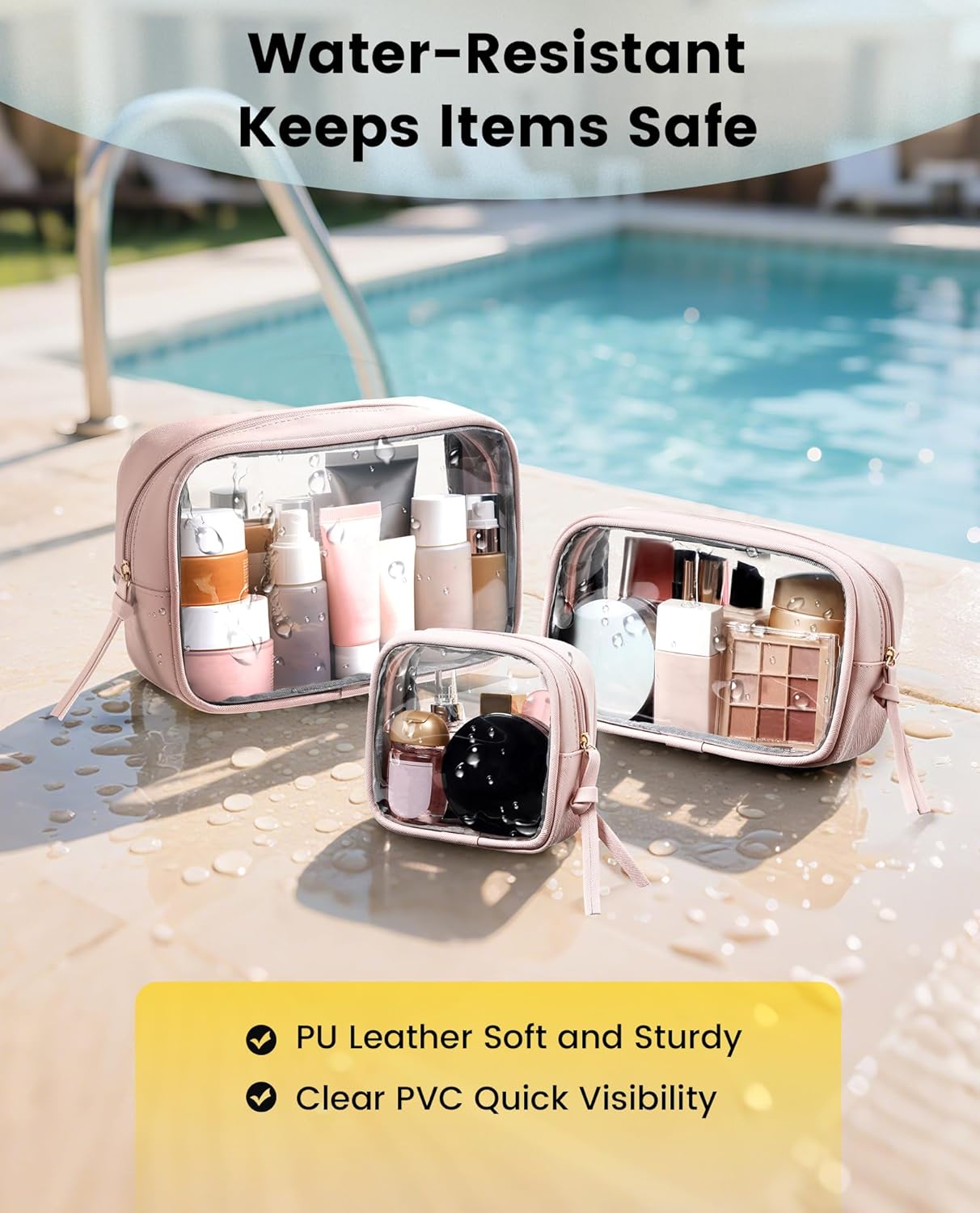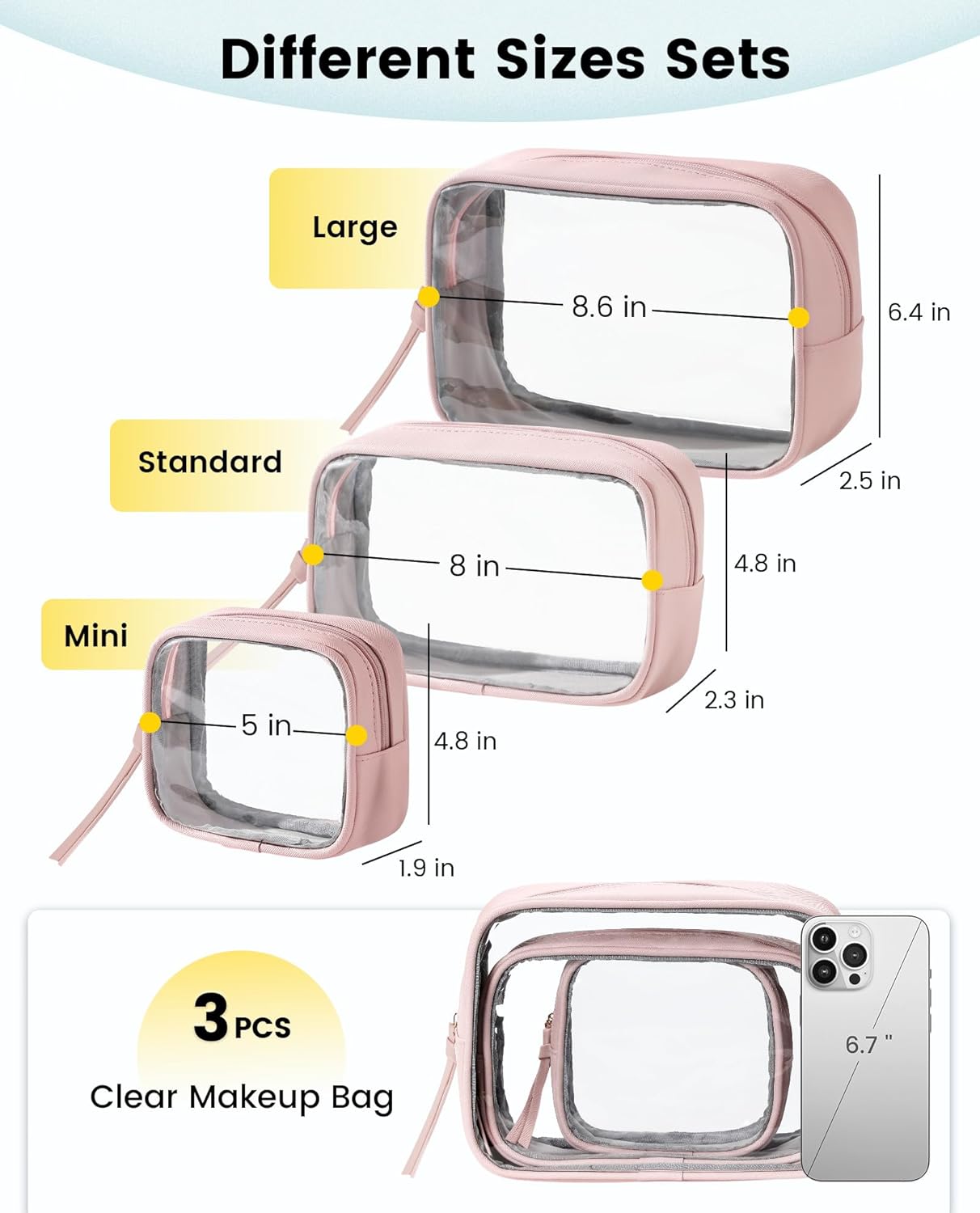 Multi size makeup bag set: This clear makeup bag is a set of 3. Including a large one (size 8.6*6.4*2.5inches) for towels, toiletries; a medium (size 8*4.8*2.3inches) for makeup, skin care; a small one (size 5*4.8*1.9 inches) for essentials, medicine, tech organizer