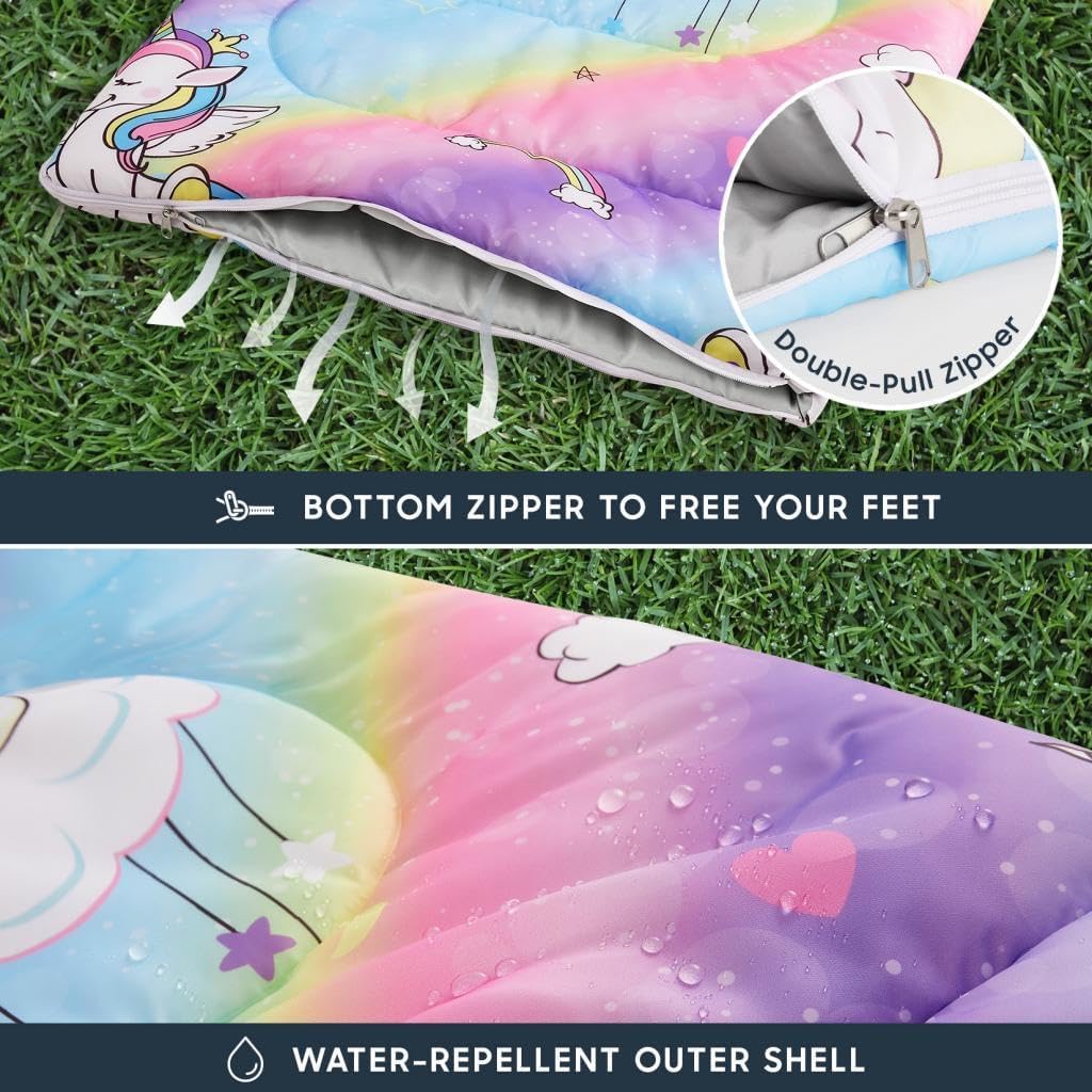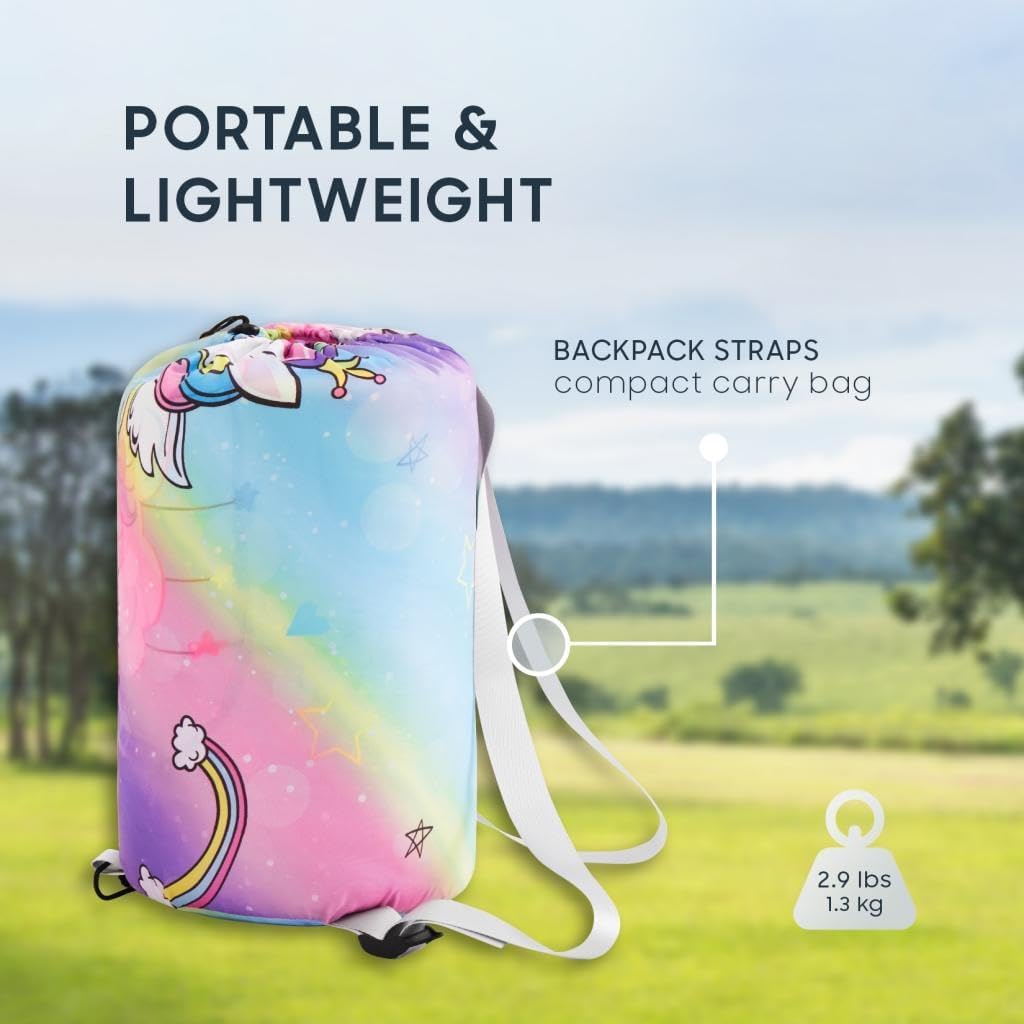 Unicorn Design: A cozy sleeping bag featuring a winged unicorn, pastel rainbows, hearts and fluffy clouds; perfect for camping adventures or indoor sleepovers