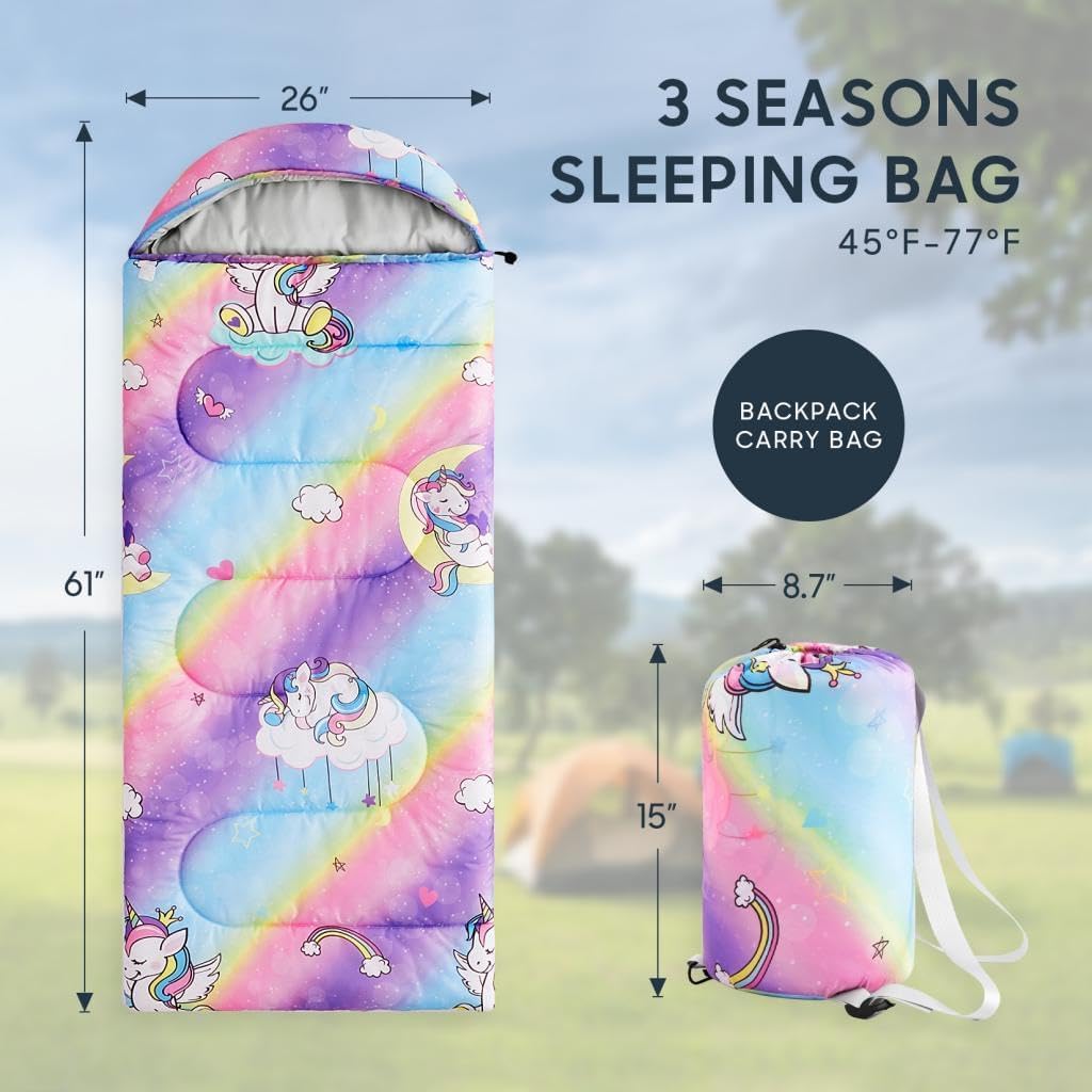 Lightweight for Backpacking: Kids camping sleeping bag, measuring 61 x 26 inches, comes with a backpack style sack and weighs 2.9 lbs; suitable for children ages 3-8 to carry on by themselves
