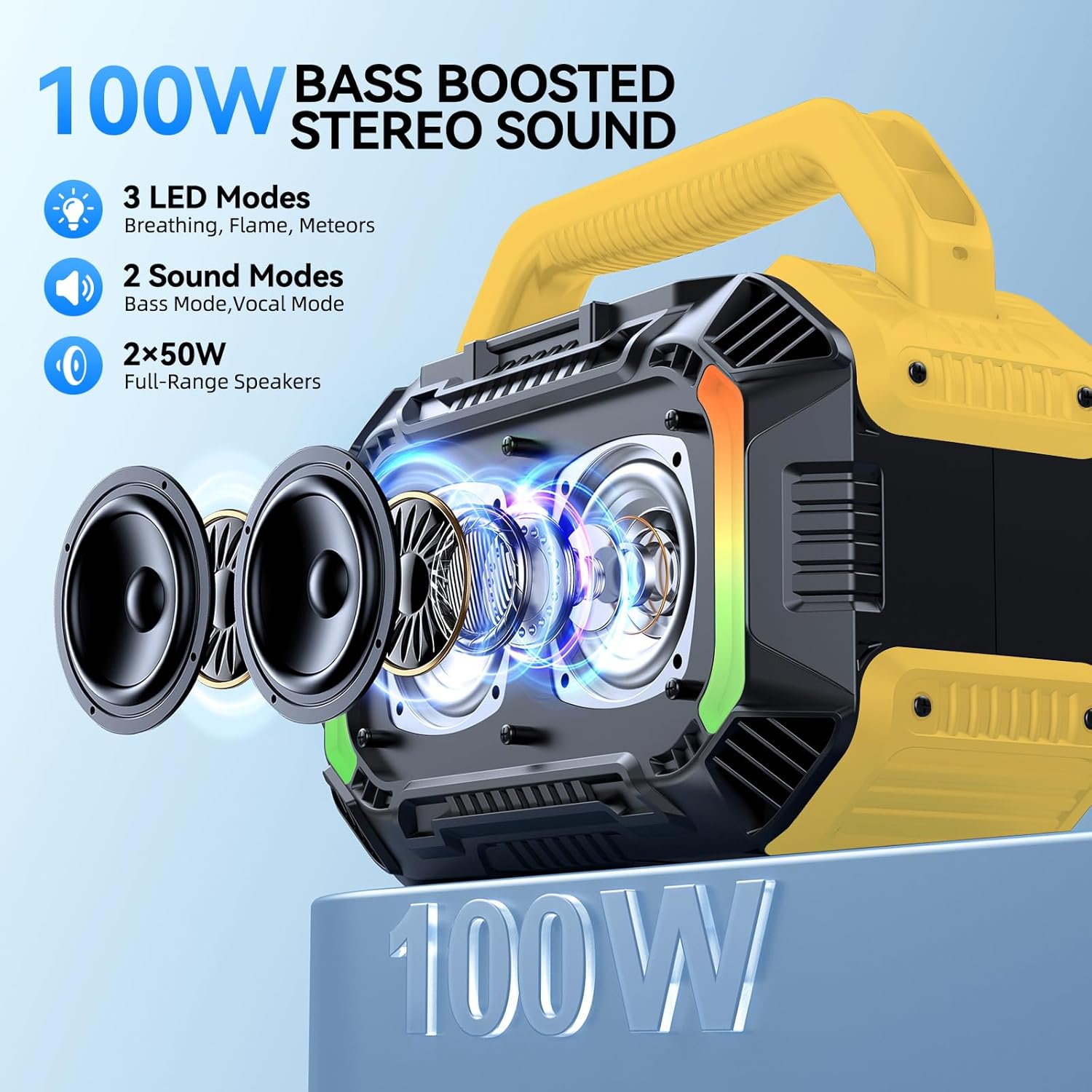 The Wilody Bluetooth Wireless Speaker redefines outdoor audio with its bold 100W peak power, rugged IPX7 waterproof design, and versatile functionality. Engineered for music lovers, work crews, and adventurers alike, this portable speaker delivers deep bass, crystal-clear vocals, and immersive sound that thrives in any environment. Whether you’re hosting a poolside party, working on a construction site, or enjoying a backyard barbecue, the Wilody speaker combines durability, long-lasting performance, and smart features to become your ultimate audio companion.