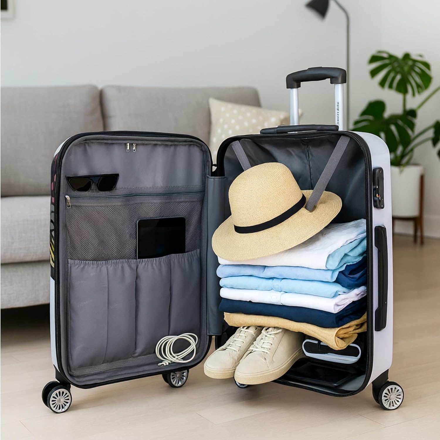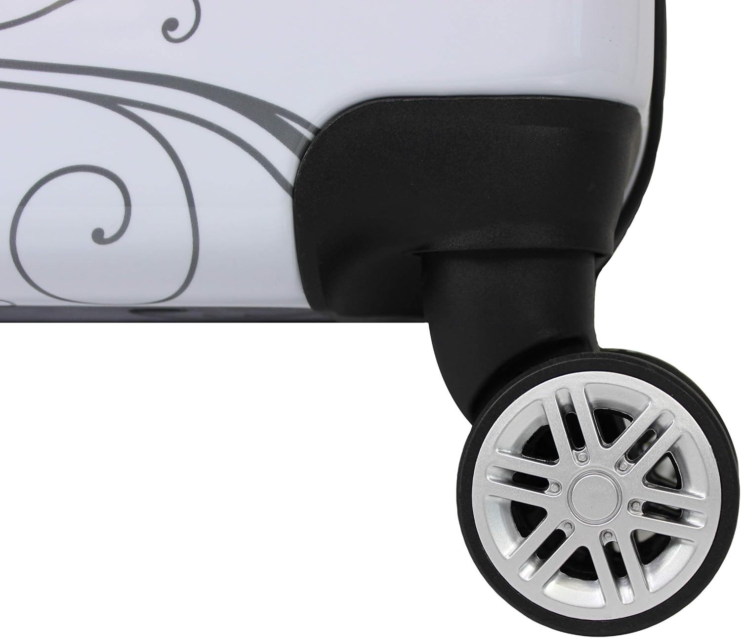 A unique butterfly emblazoned design and a dynamic exterior boasts a tough hardside construction that handles travel with grace and ease, while opening to reveal a fully stocked and versatile interior with garment restraints, accessory pockets, zipper pockets and more. Sitting confidently on 8 spinner wheels, this lightweight bag rolls in any and every direction.