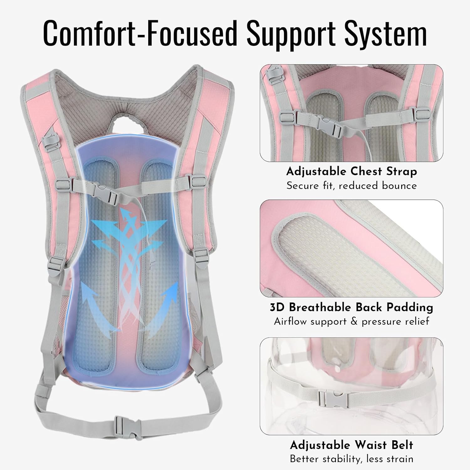 • Comfort-Focused Design – The dual-layer mesh back panel combined with foam padding promotes airflow and reduces sweat buildup during active use. Padded shoulder straps are adjustable, and the integrated chest buckle helps distribute weight evenly, minimizing fatigue on longer walks or rides.