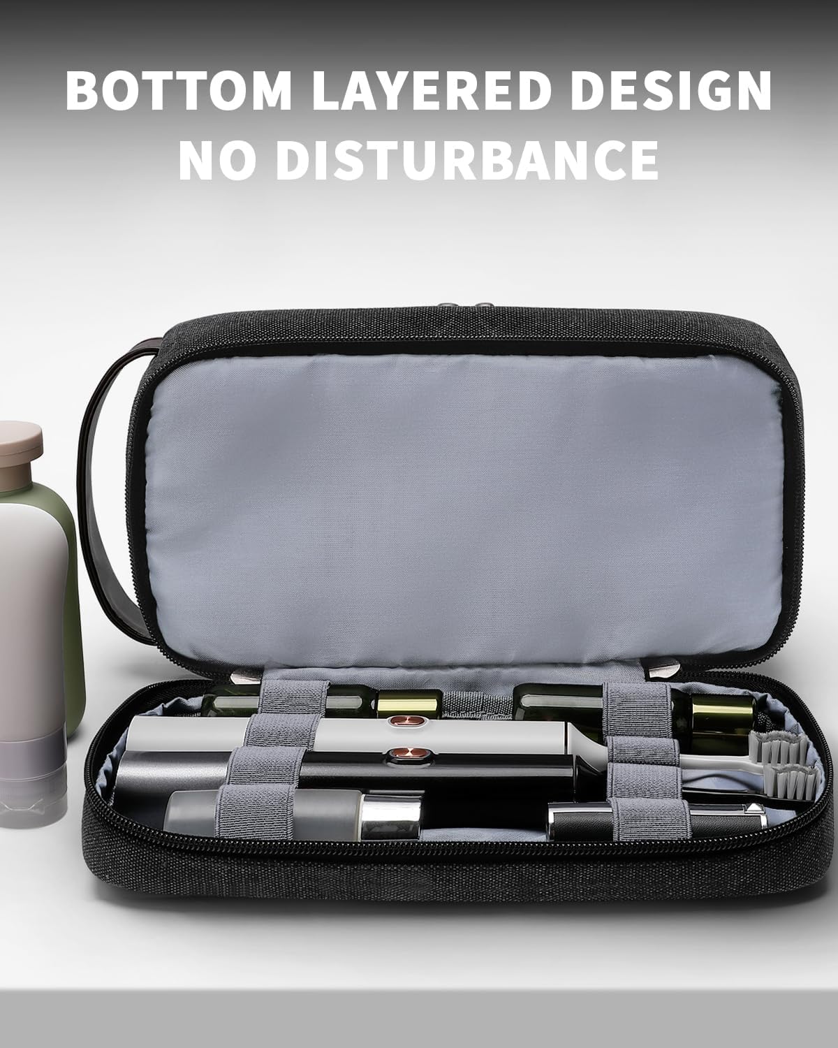 - Dual-Layer Design for Smart Organization: The ZOMFELT toiletry bag features a distinct top and bottom layer that work in harmony to keep your items separate and protected. The lower compartment is ideal for storing delicate items such as toothbrushes, razors, and cotton swabs, reducing clutter and preventing damage from accidental contact. The main upper section offers generous space with elastic straps that securely hold bottles upright, minimizing spills and making it easy to locate what you need without unpacking everything. This thoughtful separation enhances usability and keeps your grooming routine efficient.