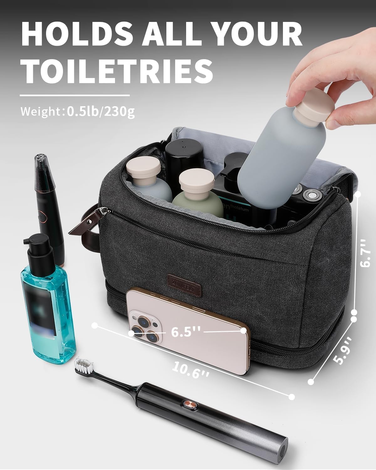 - Generous Capacity Meets Compact Size: Despite its sleek, portable shape, this toiletry bag delivers impressive storage volume. Measuring 10.6 inches in length, 5.9 inches in width, and 6.7 inches in height, it comfortably fits full-sized shampoo, conditioner, body wash, deodorant, and other standard toiletries. The large central opening allows for quick access to contents, while the front pocket provides convenient storage for frequently used small items like keys, wallets, passport clips, or travel documents. This makes it especially useful for short trips, gym sessions, or when you need immediate access to essentials without digging through your luggage.
